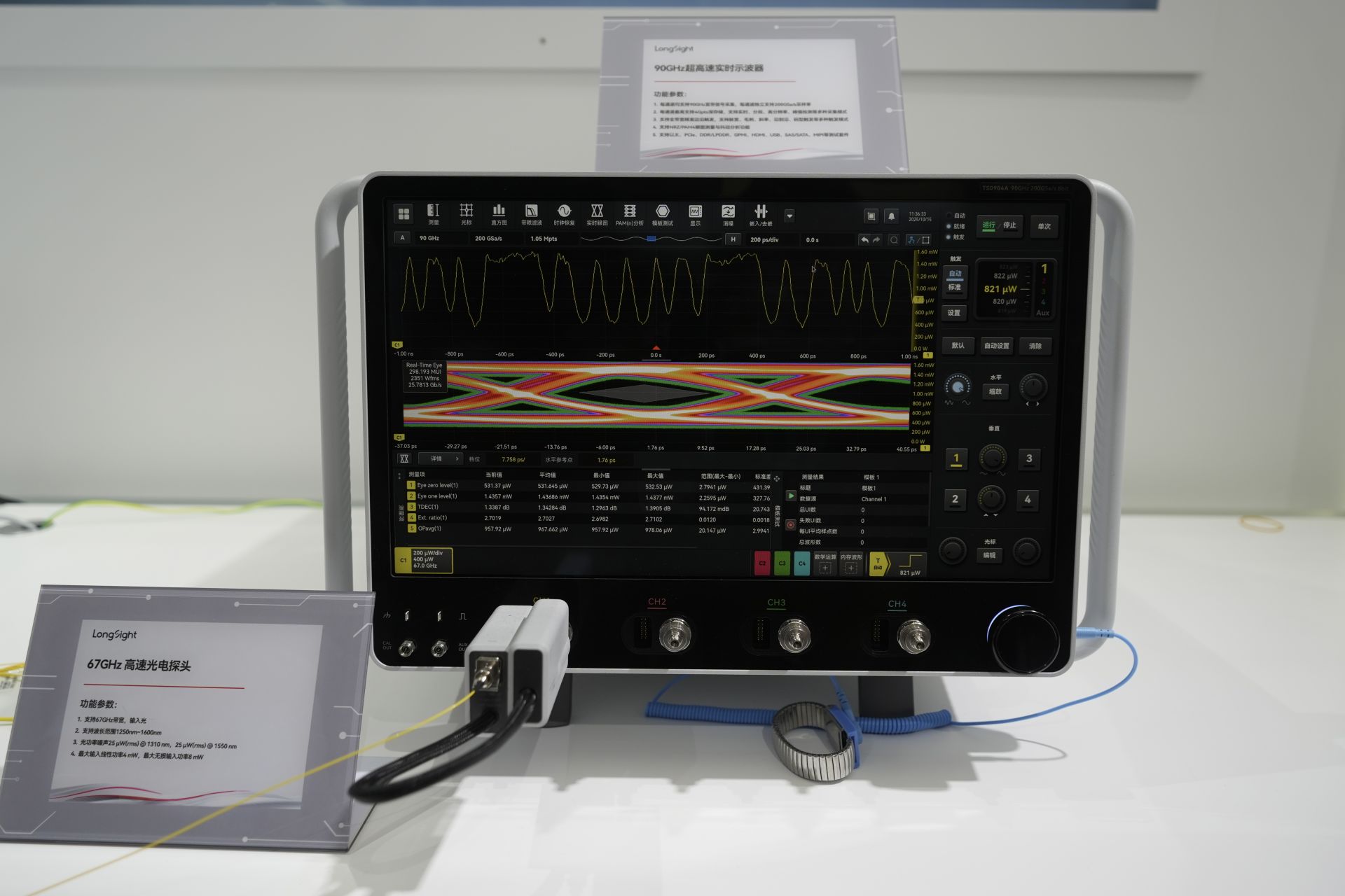 “你可以把它理解为‘电子世界的显微镜’”,业内人士形象地解释道,“专门用来‘看’电信号跑得多快,尤其是在芯片内部如此微小的空间里,信号如何高速传输、是否存在失真或干扰,都依赖这双‘眼睛’来观察。”这台90GHz示波器每个通道均支持90GHz宽带信号采集,独立采样率高达200GSa/s,配备最高4Gpts深存储,支持实时、分段、高分辨率、峰值检测等多种采集模式,能够精准还原高速信号的每一个细节。