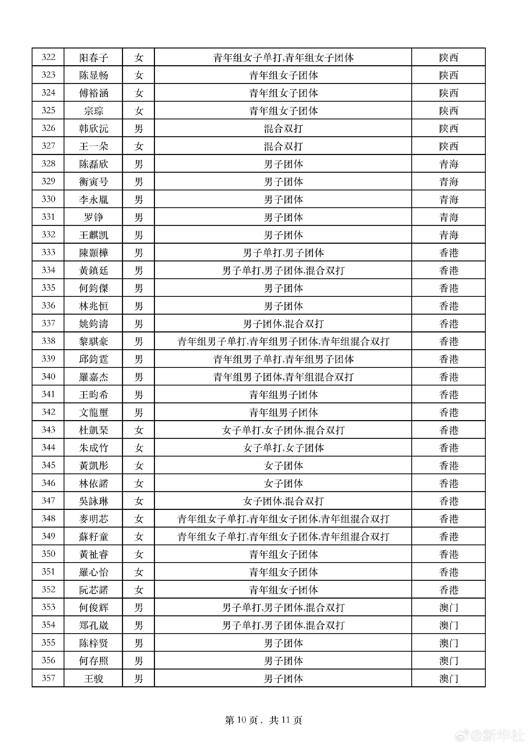 10月15日,中国乒乓球协会官网发布关于公示第十五届全国运动会乒乓球项目决赛参赛运动员名单的通知,马龙、孙颖莎、樊振东、王楚钦、王曼昱、陈幸同、蒯曼、王艺迪、林诗栋、梁靖崑、林高远、向鹏、周启豪等运动员的报项已出炉。第十五届全国运动会乒乓球项目决赛将于11月7日至20日在澳门举办,一起为所有运动员加油!