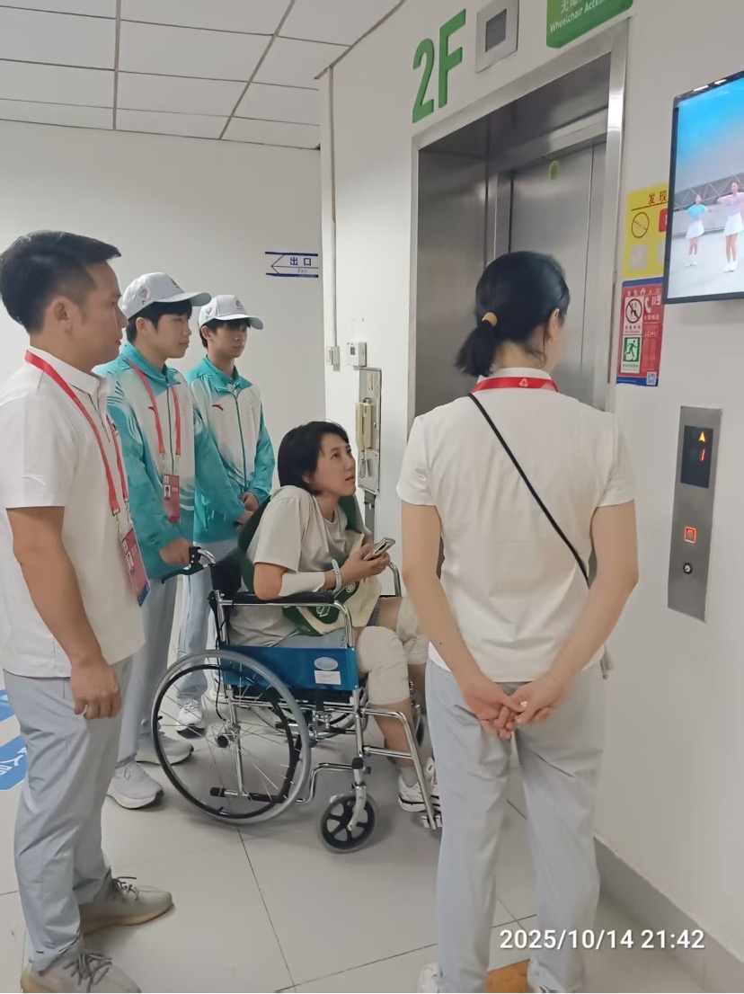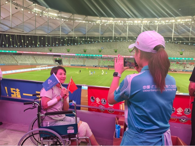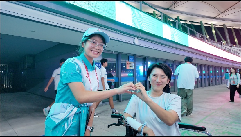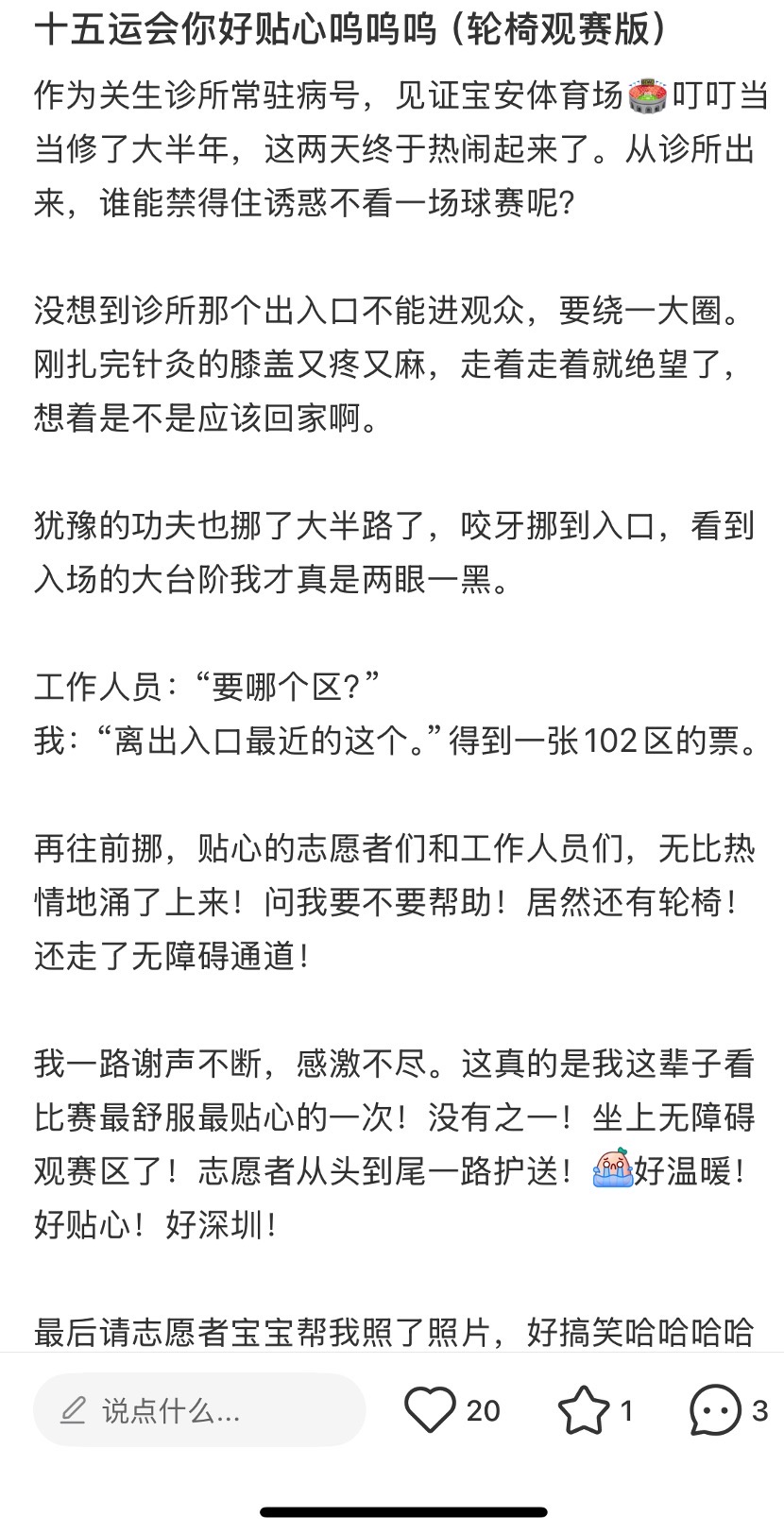 这位刚进行了膝盖治疗、行动有些不便的市民名叫高萌泽,她在十五运会宝安体育场受到了“小海豚”志愿者专业、无缝衔接的无障碍引导。当天,面对入场的数级大台阶,膝盖的疼痛让高萌泽一度想要放弃观赛。就在这时,一支充满活力的“小海豚”志愿者团队敏锐地发现了她的困境。“志愿者无比热情地涌了上来!问我要不要帮助,居然还有轮椅!还走了无障碍通道!”她在社交平台分享中连用三个感叹号表达惊喜。志愿者们一路护送,直至将她安稳地安排到无障碍观赛区。这一连串的专业操作,让她在场内谢声不断,直呼“好温暖!好贴心!好深圳!”