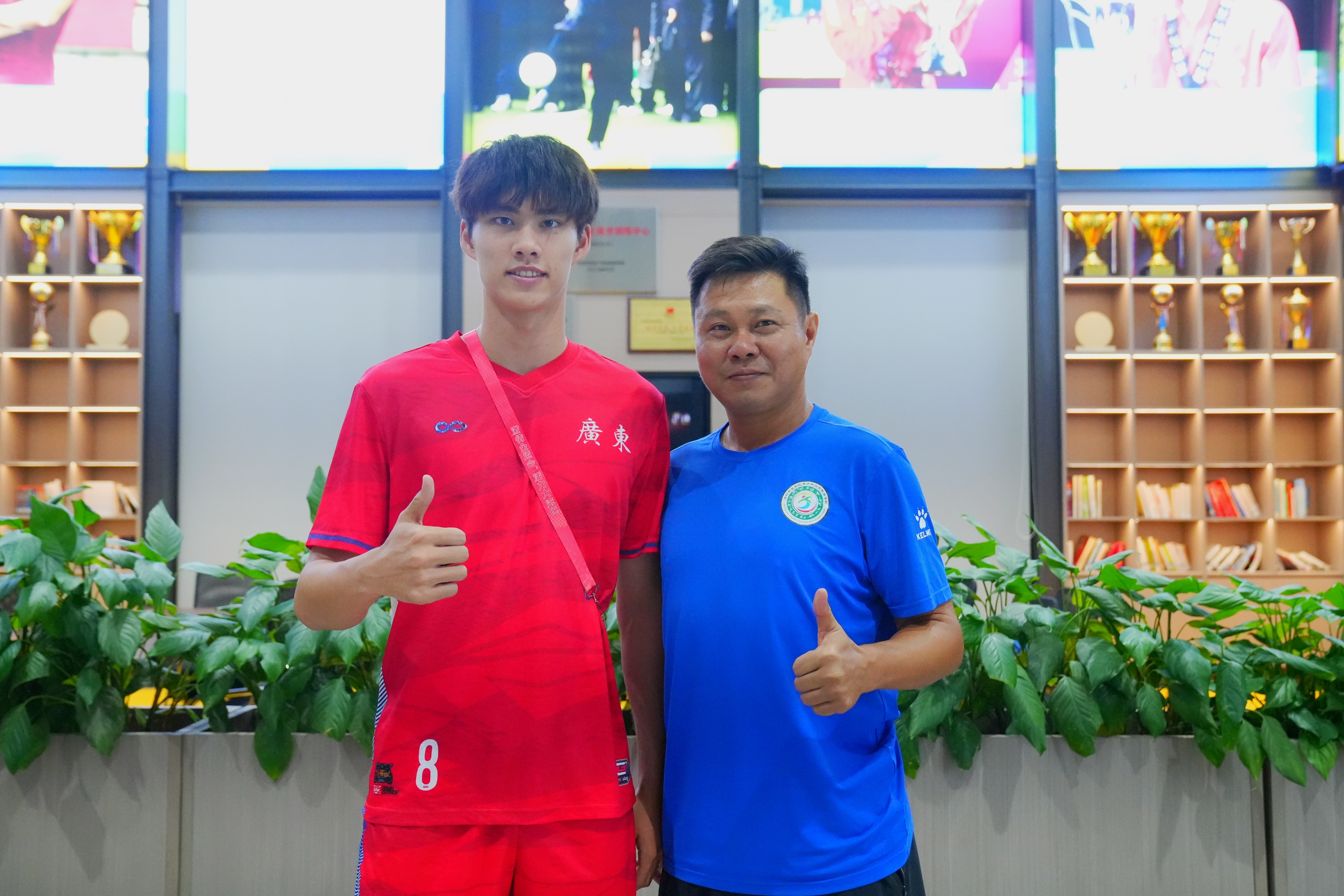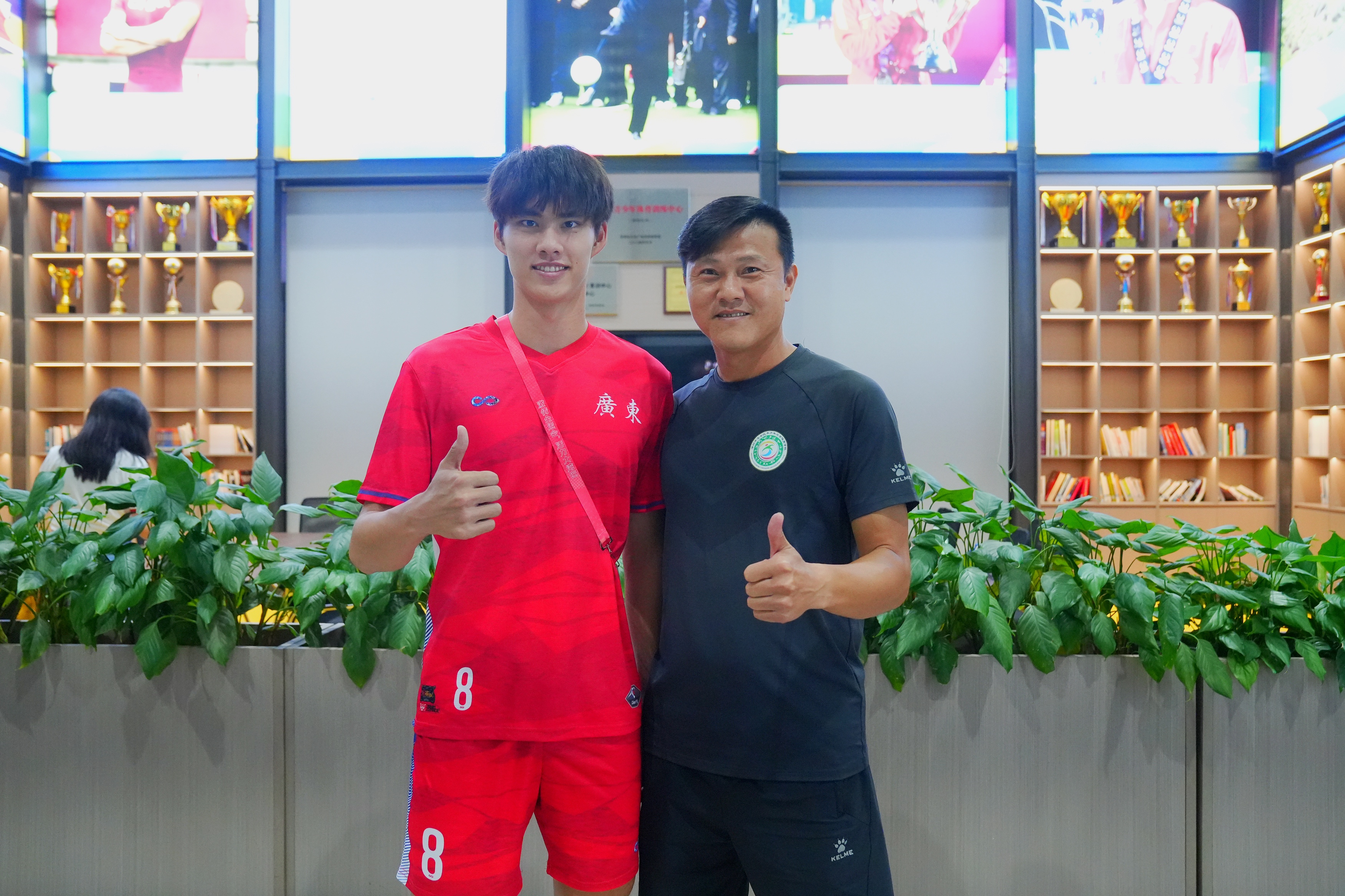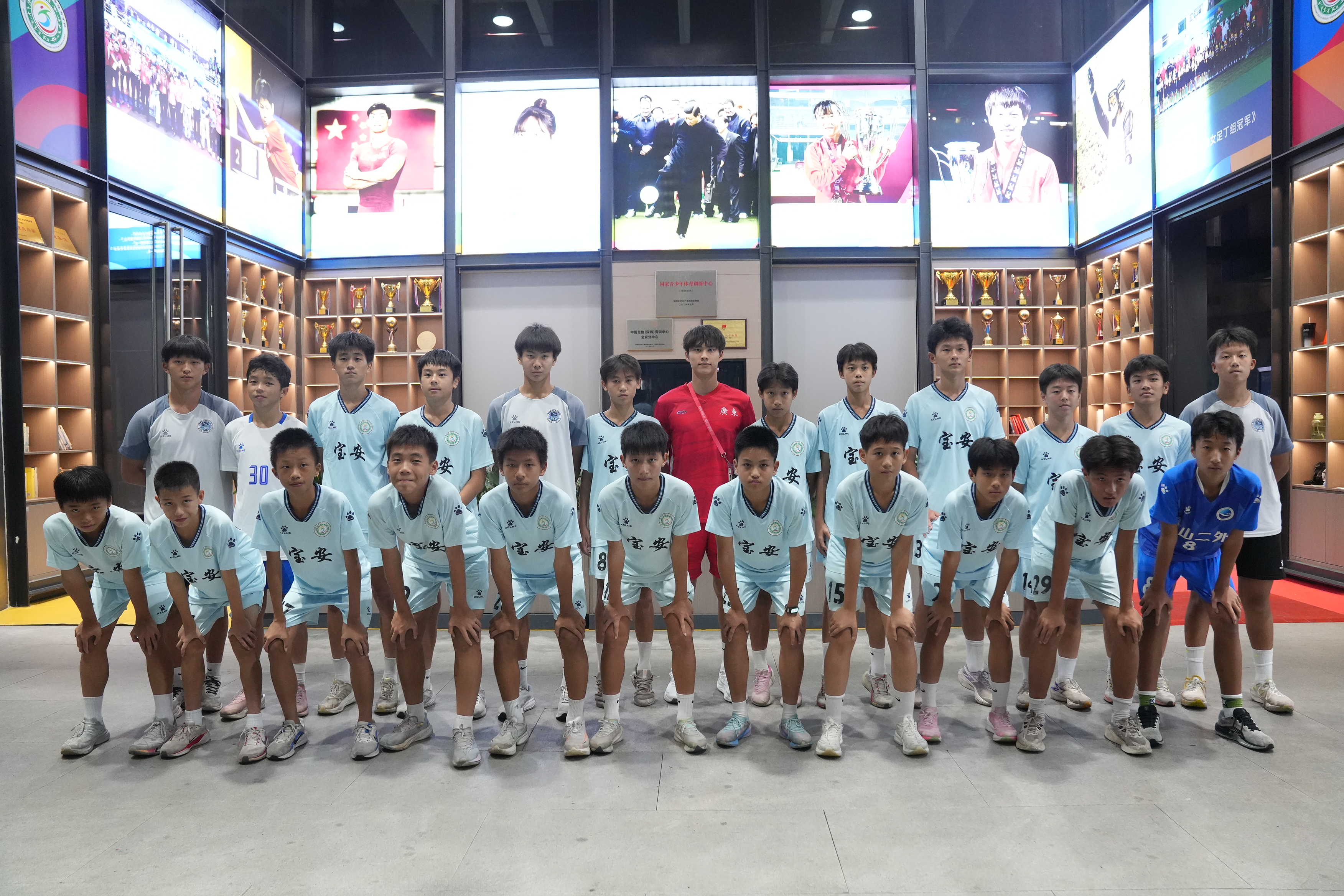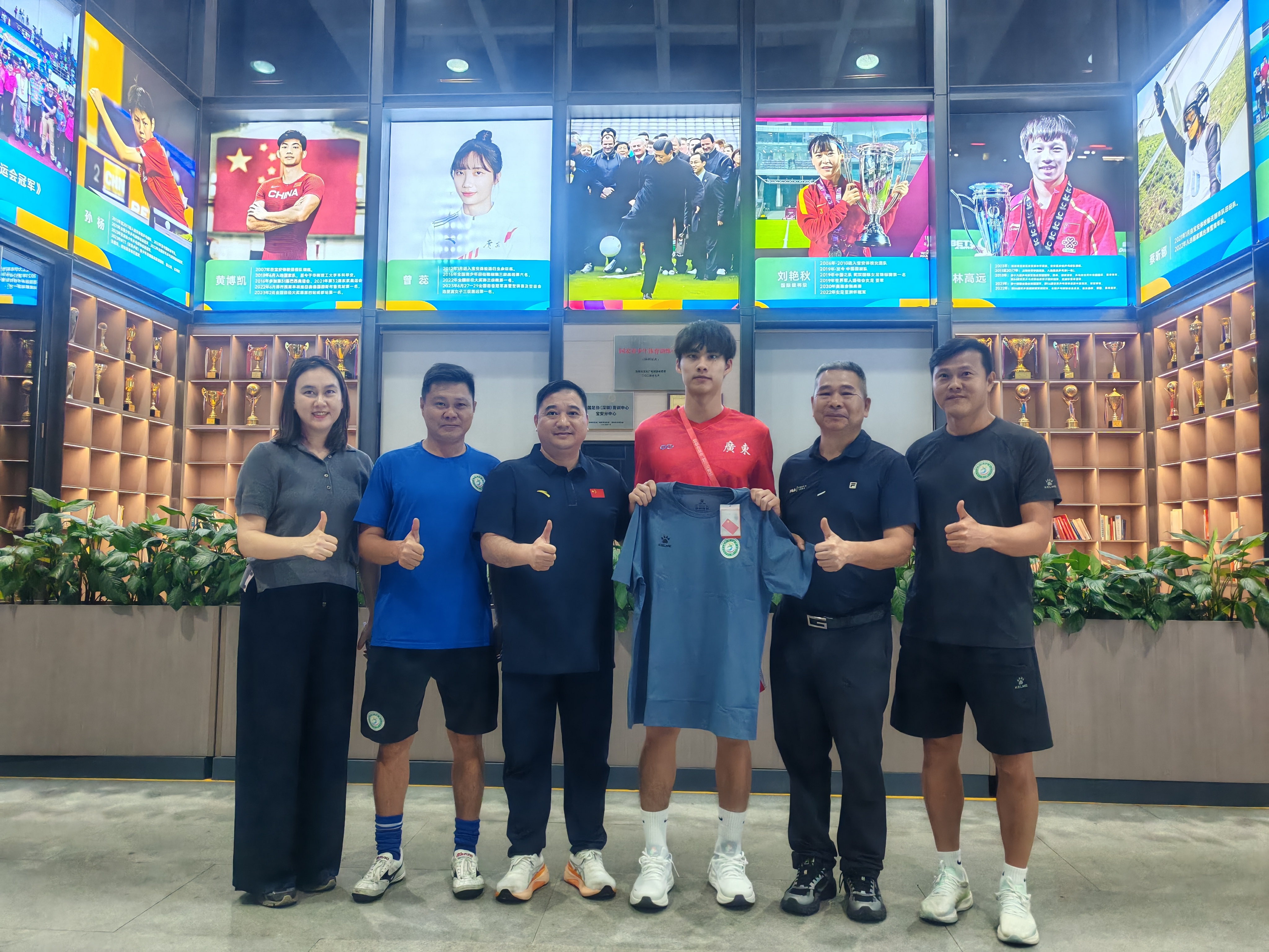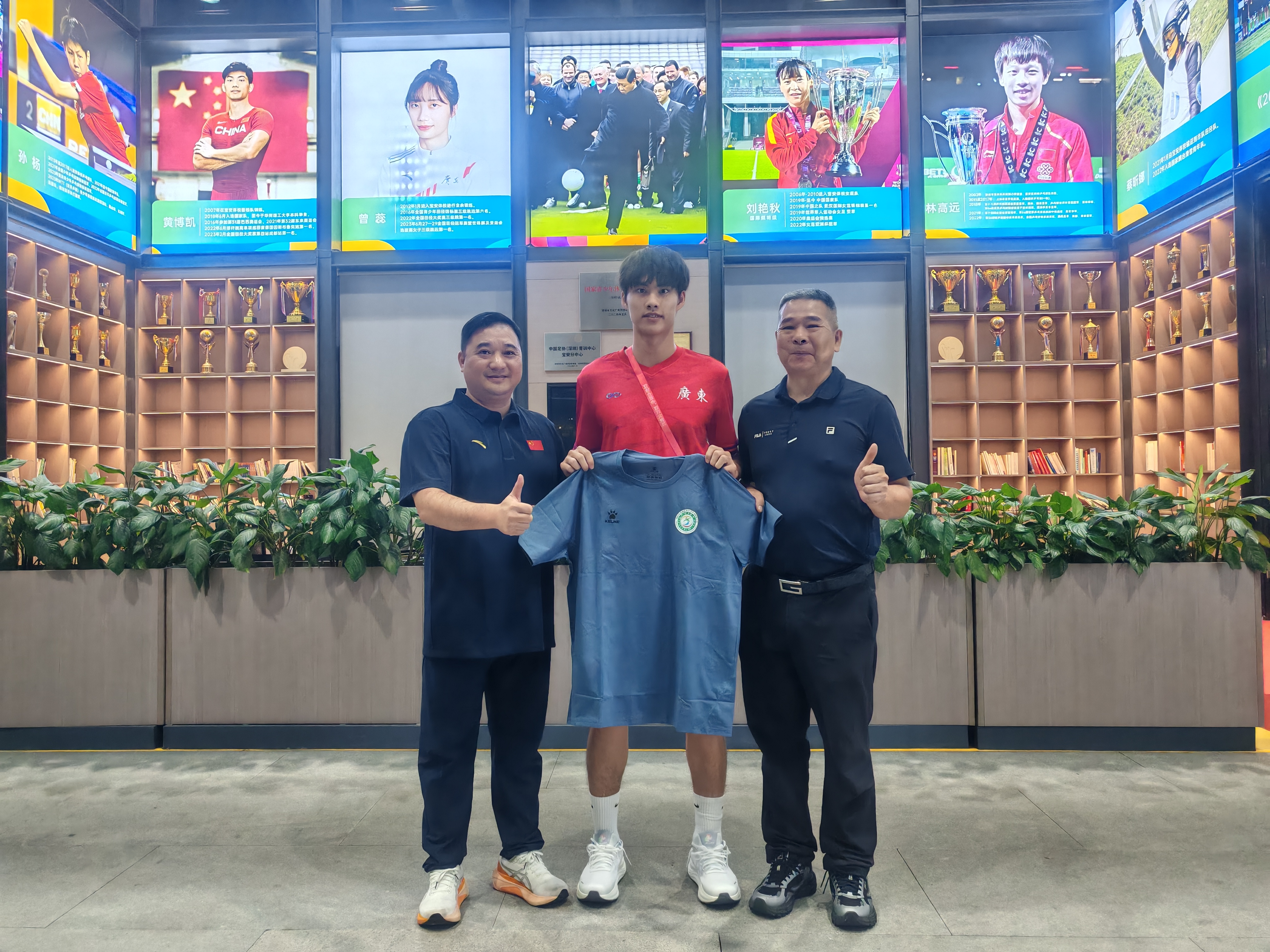 走进体校大厅,潘锘均眼中闪着光。宝安男足教练王亿迎面走来,拍了拍这位昔日爱徒。宝安体校校长彭玉华手持一件崭新的体校队服,赠予这位广东U18全运男足队长。大厅上方悬挂着林高远、黄博凯等宝安体育名将的巨幅海报。“潘锘均,今年拿下十五运会冠军,明年这里就有你的位置。”副校长郭科峰指着“宝安荣耀”展区鼓励他。