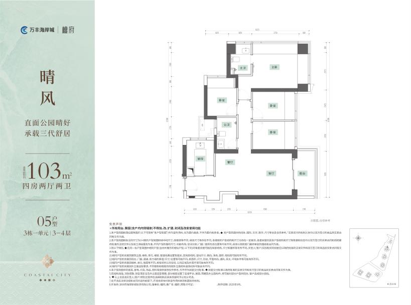 约103㎡4房2厅2卫为改善舒居,轻松实现三代同堂;四开间约12米采光面,室内环境更通透;主卧双飘窗+进门过道,可承载更多收纳空间。