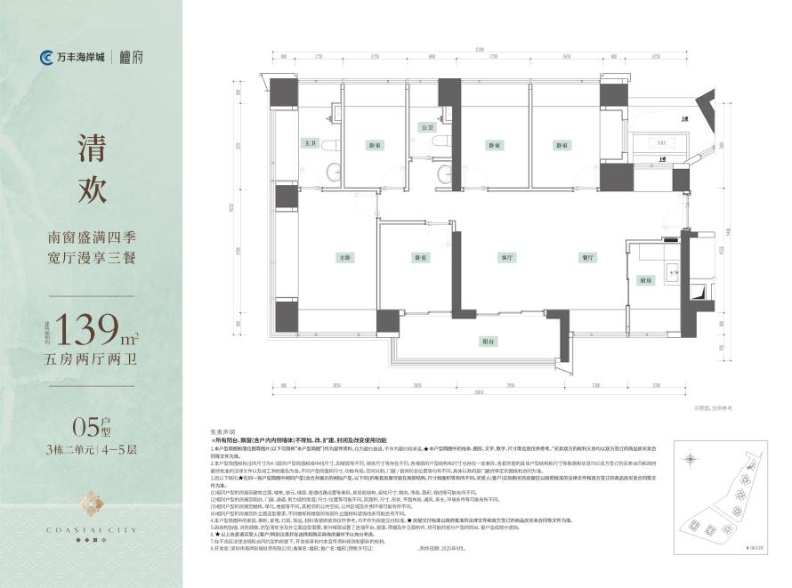 约139㎡的5房2厅2卫,南向横厅大五房,南北通透,片区独有!15米大面宽,约6.8米景观阳台,无遮挡公园视野;奢配主卧进深4.5米,主卫双飘窗采光可作双台盆;全屋12个飘窗,懂收纳更懂空间使用!