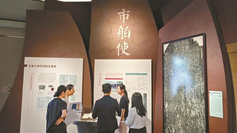 在展陈设计上,展览注重沉浸式体验与学术深度的融合,对唐代市舶使设立、宋元市舶法规、明中期“广中事例”、清“一口通商”、新中国广交会创立及新时代自贸区建设等关键节点,通过大字体、突出色彩与时间轴进行强化呈现,助力观众直观、准确地把握外贸制度的演变脉络。展览还配备触摸互动屏,以动画形式解读广东外贸历史,增强观展的趣味性与参与感。