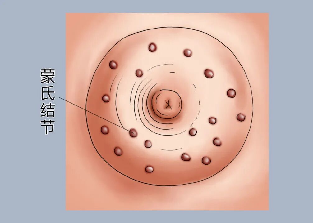 蒙氏结节的名字源自医生威廉 · 蒙哥马利,是乳晕边缘那些微微隆起的小点,摸起来有点像芝麻粒那么大,通常有10-15个,均匀分布在乳晕上。