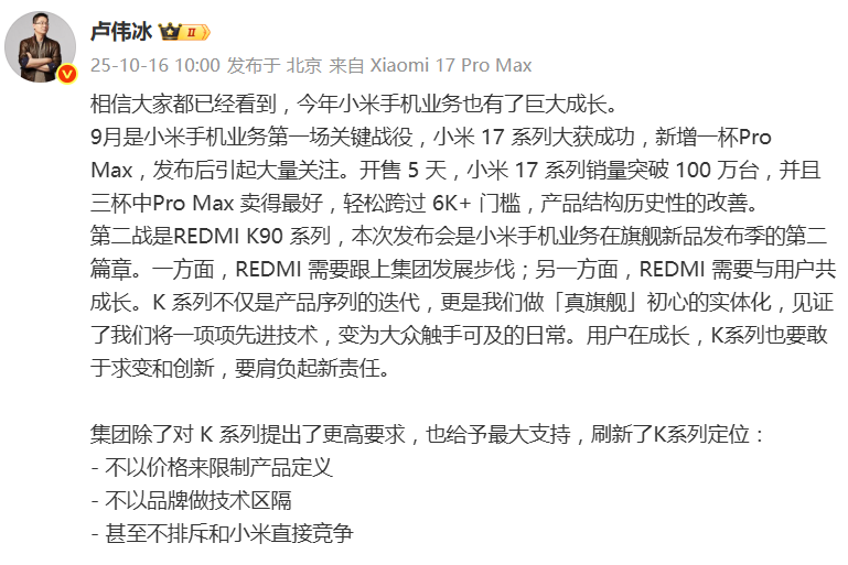 小米集团合伙人、总裁、手机部总裁、小米品牌总经理卢伟冰10月16日在微博发长文宣布,全新REDMI K90系列下周见,本次发布会是小米手机业务在旗舰新品发布季的第二篇章。