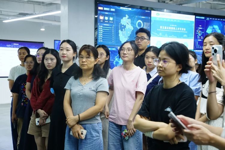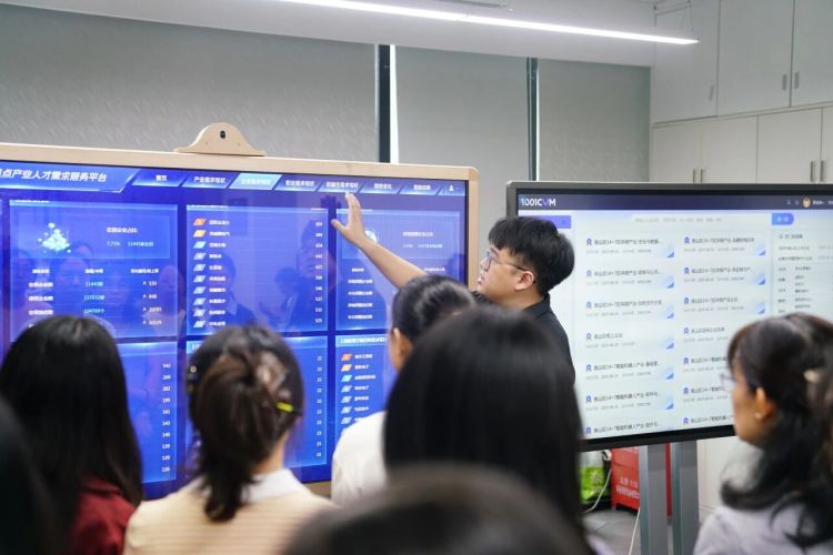体验活动的第一站,老师们步入了充满科技感的“业”问全景数字体验馆” (广东省人才大数据技术研究中心)。老师们仿佛穿越至未来,通过“20+8”产业集群的动态图谱和实时更新的行业人才需求数据,洞察现在、预见未来。