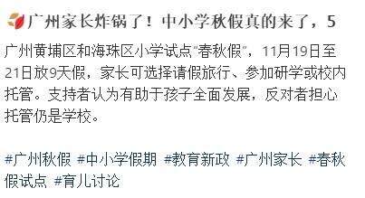 近日,网传“广州黄埔区和海珠区小学试点‘春秋假’,11月19日至21日放9天假”,为此,记者求证广州市教育局及海珠区教育局。