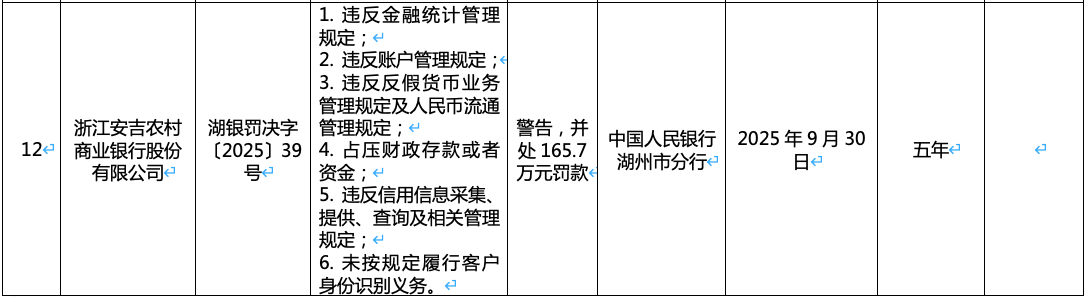10月15日,中国人民银行湖州市分行行政处罚决定信息公示表(湖银罚决字〔2025〕28-39号)显示,浙江安吉农村商业银行股份有限公司因6项违规行为,被警告并处165.7万元罚款;10名相关责任人同步被追责,罚款金额从0.5万元至1万元不等。