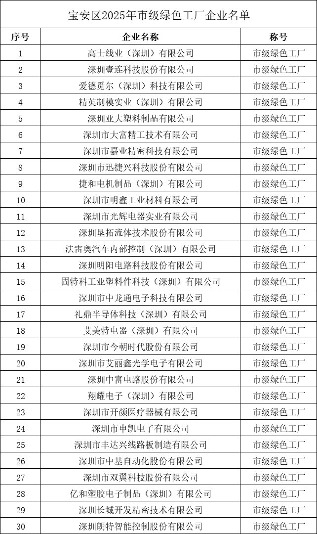 数量全市第一!宝安30家企业入选深圳市绿色工厂