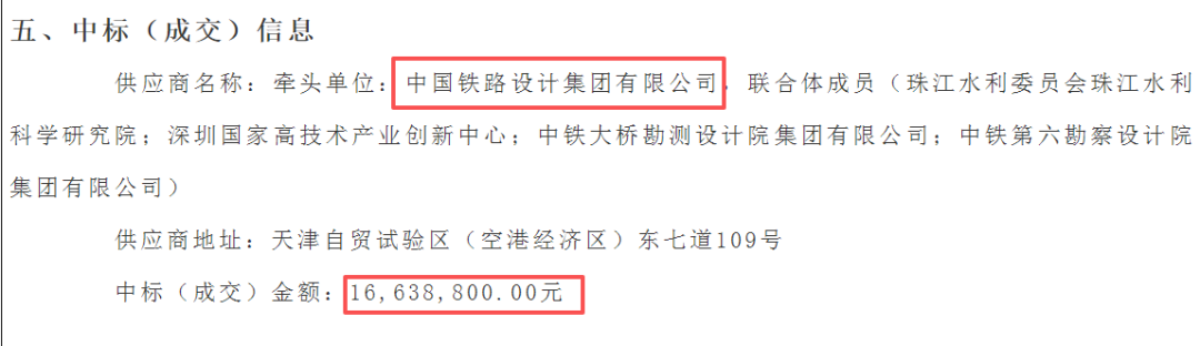 根据深圳公共资源交易中心官网公告显示,深珠通道前期研究中标供应商牵头单位为中国铁路设计集团有限公司,联合体成员(珠江水利委员会珠江水利科学研究院,深圳国家高技术产业创新中心,中铁大桥勘测设计院集团有限公司,中铁第六勘察设计院集团有限公司)中标,中标(成交)金额1663.88万元。