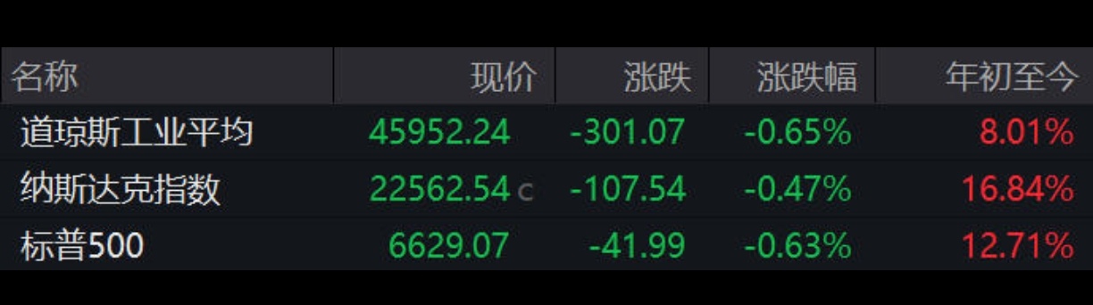 截至收盘,道指跌0.65%报45952.24点,标普500指数跌0.63%报6629.07点,纳指跌0.47%报22562.54点。