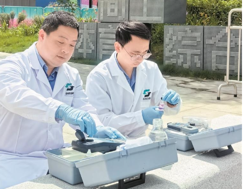 水质检测员对简上体育综合体周边水质进行抽样检测。