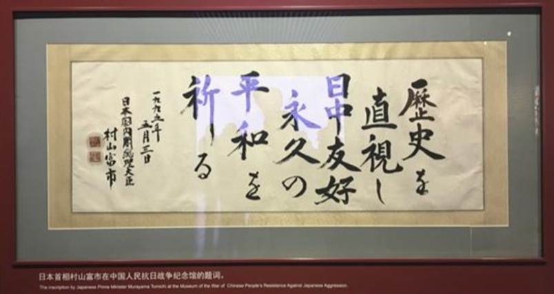村山富市在任期间曾于1995年5月访华,成为首位到访卢沟桥和中国人民抗日战争纪念馆的日本在任首相,并留下“正视历史,祈日中友好、永久和平”的题词。