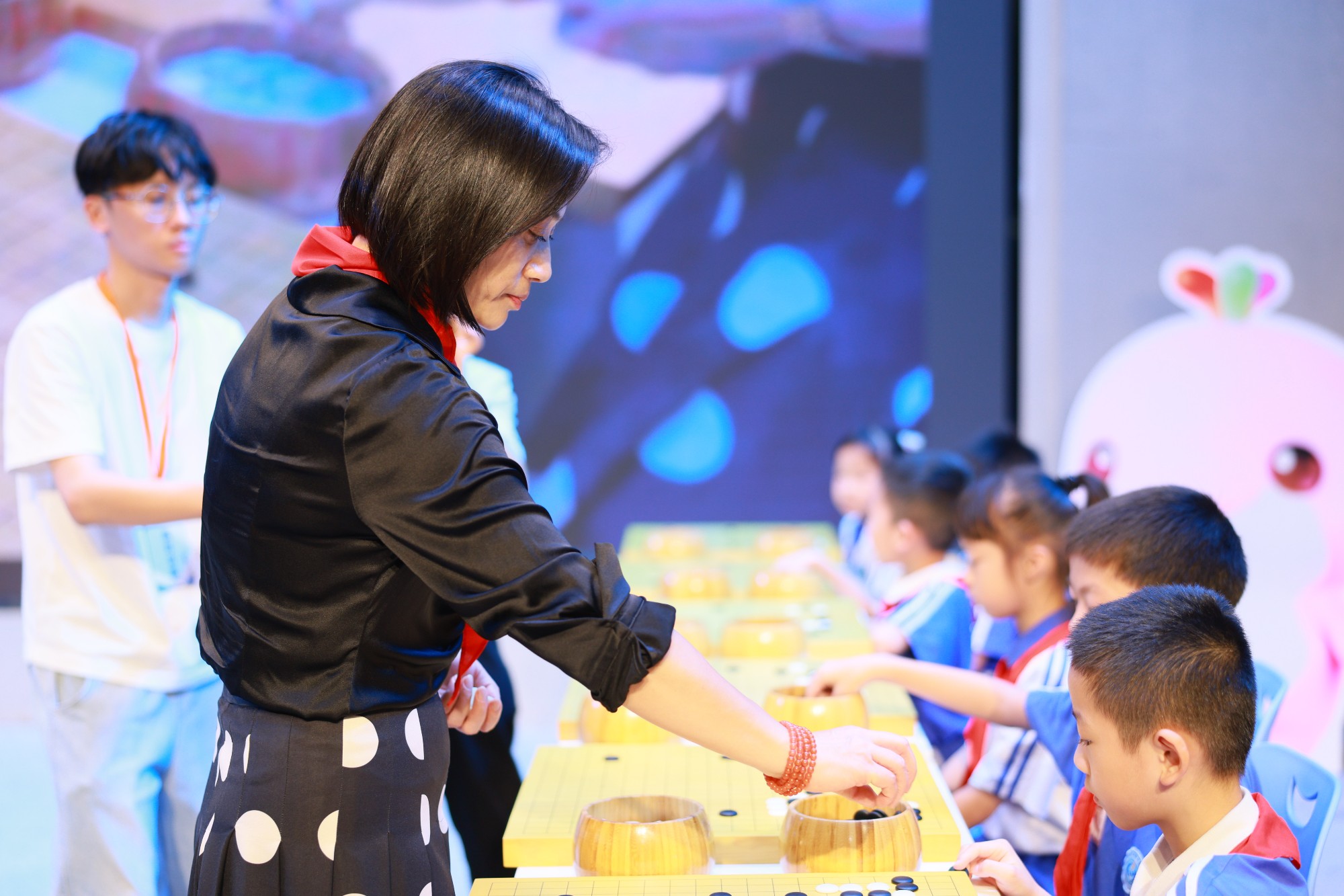 随后,最令人期待的环节——“大师车轮战”正式上演。围棋世界冠军杨楷文、世界女子职业围棋赛冠军徐莹两位棋手联袂登场,与罗湖外语小学的20位小棋手展开了一场别开生面的2VS20车轮大战。
