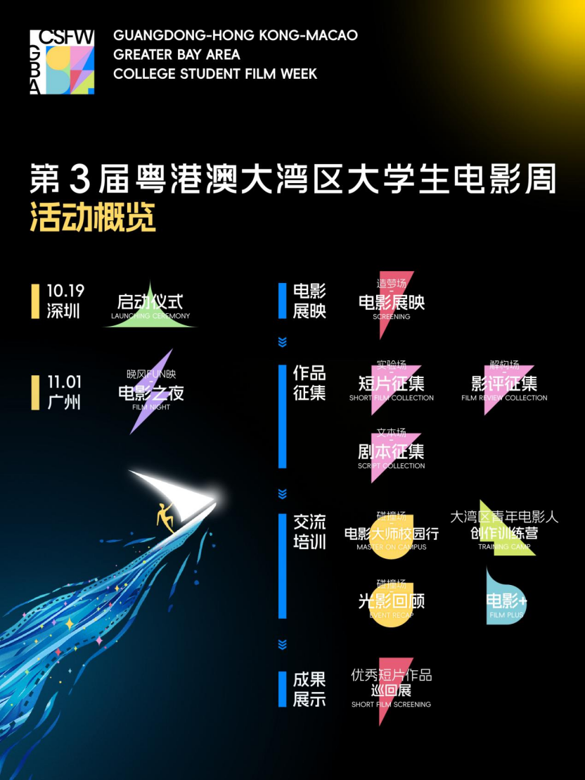 本次活动由广东省电影局、广东省教育厅、共青团广东省委、广东省文学艺术界联合会、香港文化体育及旅游局、澳门文化局指导,广州市委宣传部、深圳市委宣传部支持,广东省电影家协会等单位主办,深圳出版集团有限公司、广州有好戏网络科技有限公司等单位承办,覆盖大湾区多所高校。
