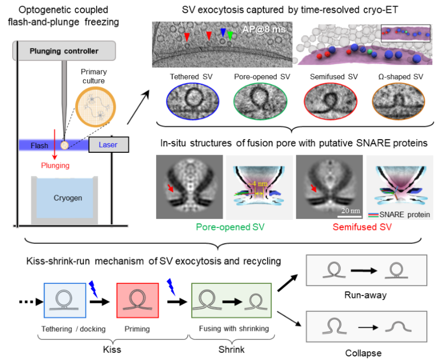在该研究中,科研团队通过自主研发的毫秒级时间分辨原位冷冻电镜成像技术,破解了神经信息传递过程中,突触囊泡释放与快速回收的完整生物物理过程,并提出“亲吻-收缩-逃逸/融合”模型。这一成果统一了科学界关于突触囊泡释放与回收机制长达50年的两个争议模型,为理解神经信号传递、神经可塑性及相关脑疾病机理提供了全新视角。