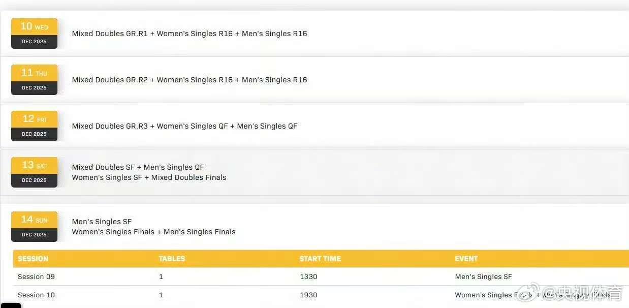 12月14日:男单半决赛,男单、女单决赛。