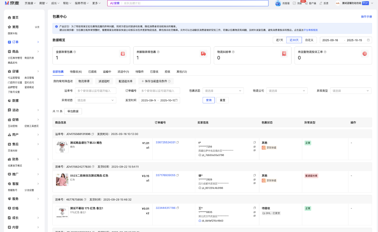 为了有效解决商家在物流履约环节面临的异常问题,平台上线“包裹中心”功能。该功能聚焦物流停滞、派送超时、配送超时三大核心异常场景,提供主动预警,帮助商家及早发现潜在风险。同时,整合了补发、物流工单回复及物流纠纷单处理等关键能力,为商家打造一站式高效处理平台,相关消费者咨询投诉概率下降超20%。