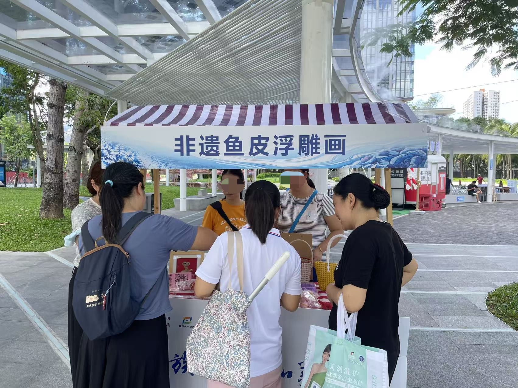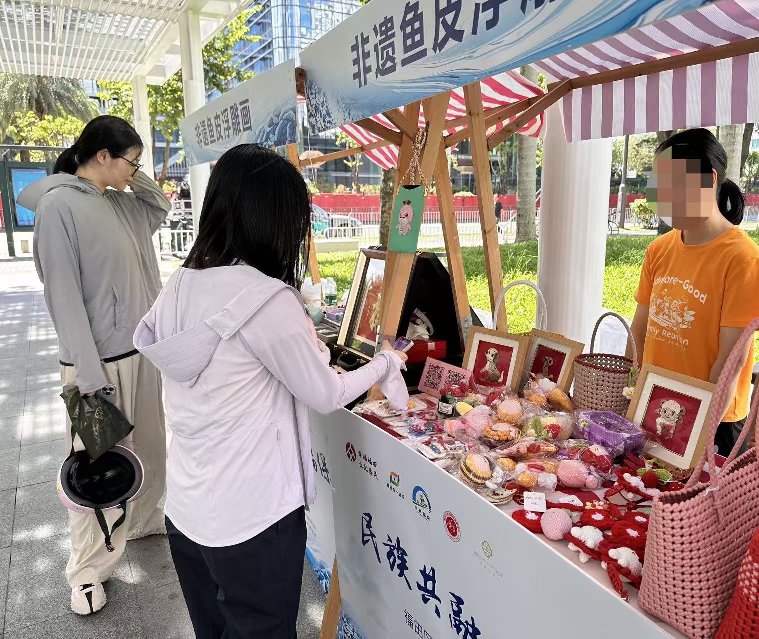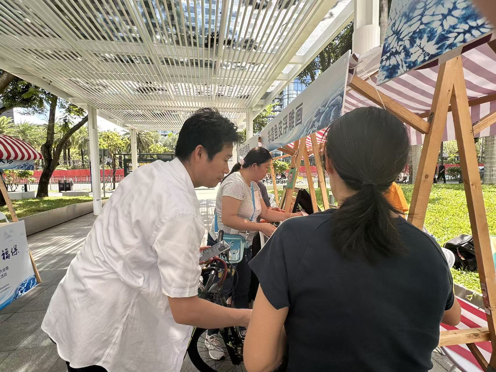 集市实训活动旨在为参与技能培训的残疾人提供一个真实的商业实践平台。在首阶段系统学习鱼皮制作技艺后,学员们走进集市,将亲手制作的鱼皮画及其他在职康中心日常创作的编织包包、钩织挂饰、衍纸作品等各类手工艺品进行集中展示和义卖。他们热情地向过往市民介绍产品特色、制作工艺及其背后蕴含的文化故事,通过主动叫卖、互动演示等多种方式,积极进行销售实践。琳琅满目的文创产品吸引了大量市民驻足观赏、咨询和购买,现场气氛热烈。