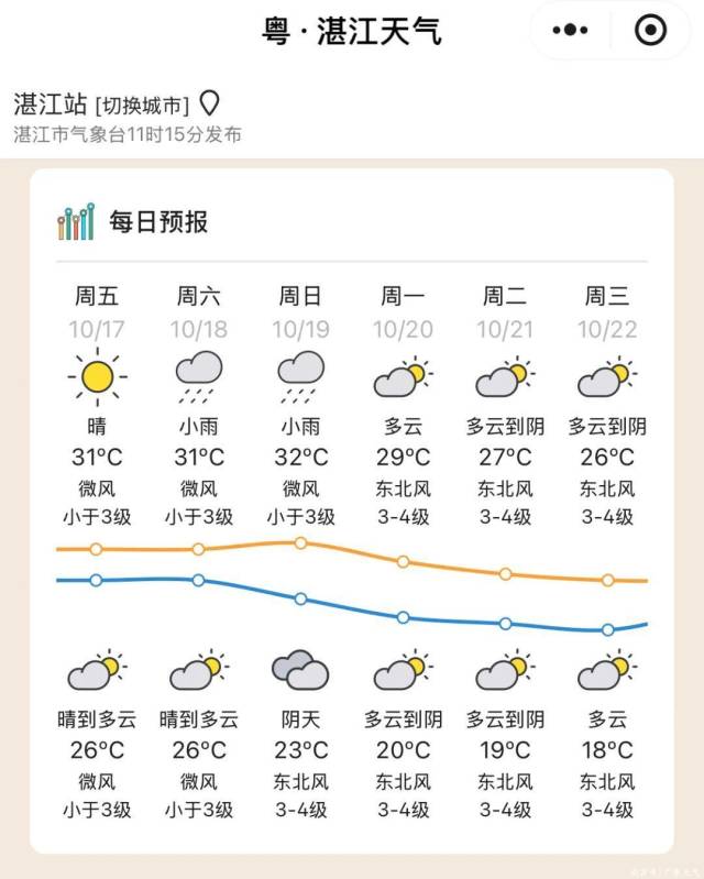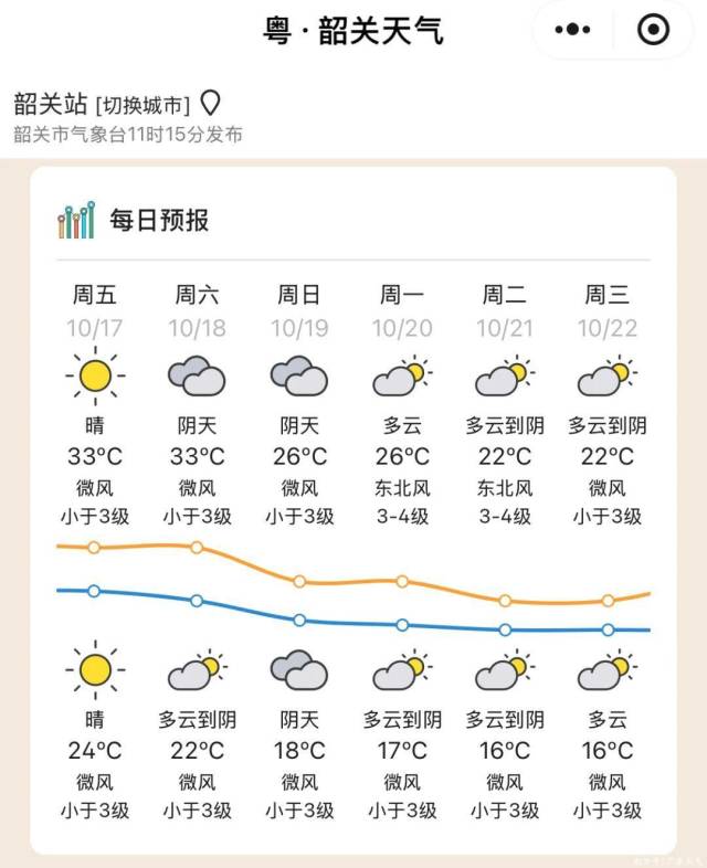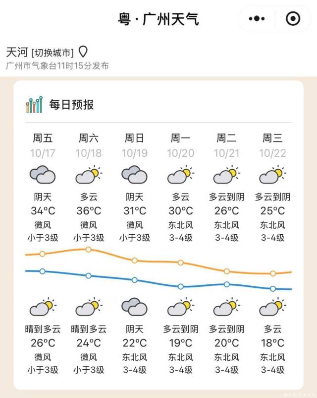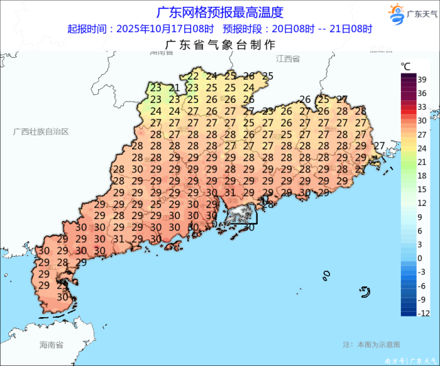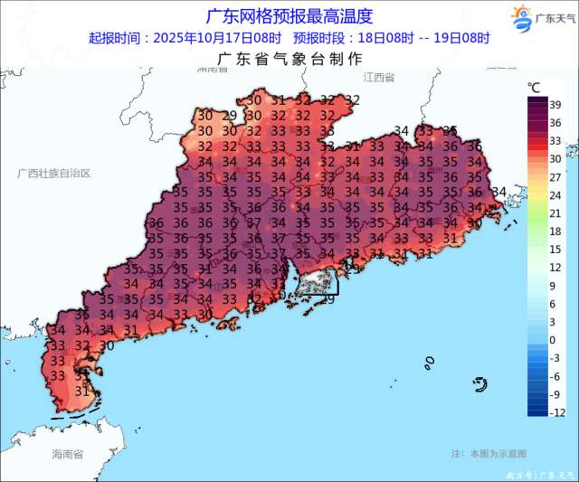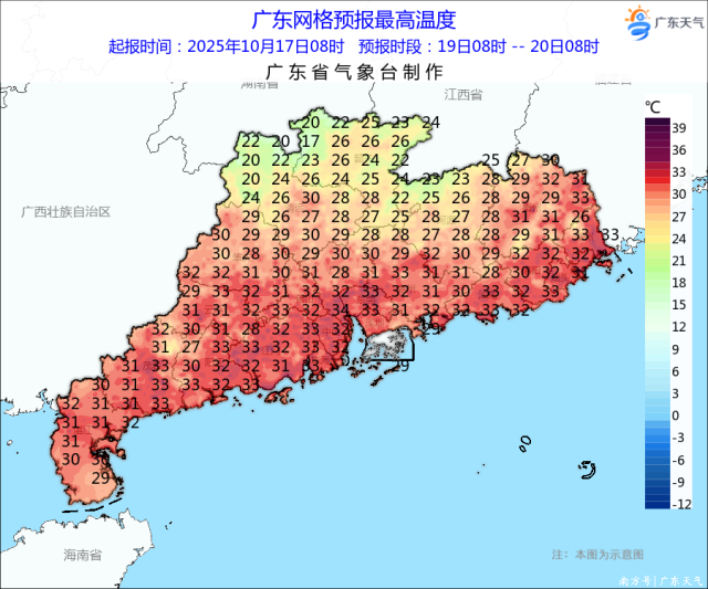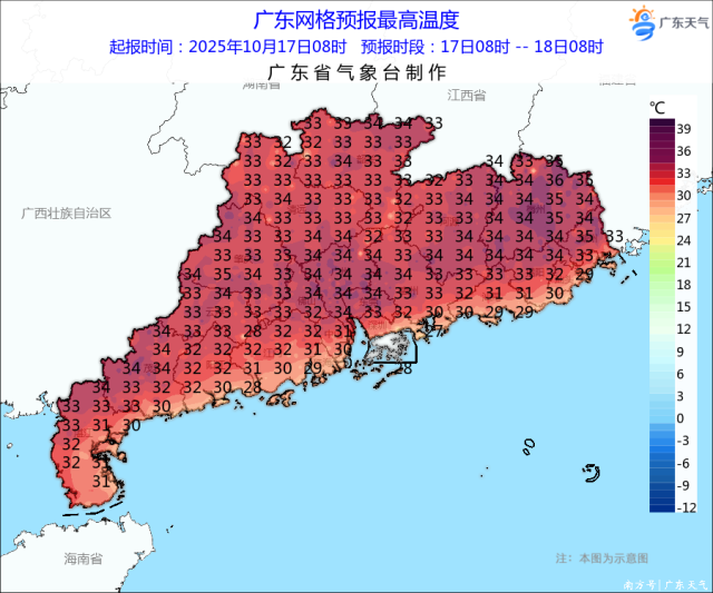17日:粤西和粤北偏北市县30~32℃,其余大部市县33~35℃。