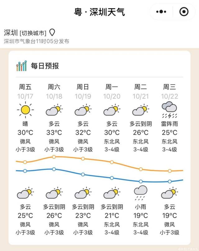 19日:清远北部和韶关北部22~27℃,粤北其余市县和珠三角北部市县28~31℃,其余大部市县31~33℃。