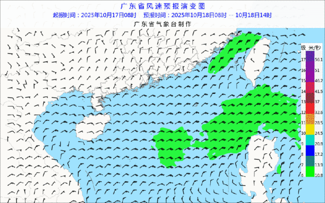 19-24日,南海东北部和广东省沿海海域自东向西风力将加大到7~8级、阵风9~10级,热带气旋中心经过的附近海域风力11~12级、阵风13级。20-22日,广东沿海市县和高地阵风加大至6~8级。