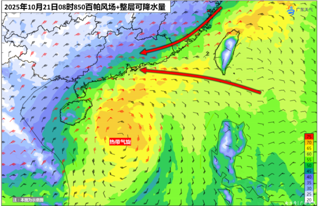 冷空气是高压,热带系统是低压,北高南低的气压梯度会给广东的陆地和海上带来大风天气。