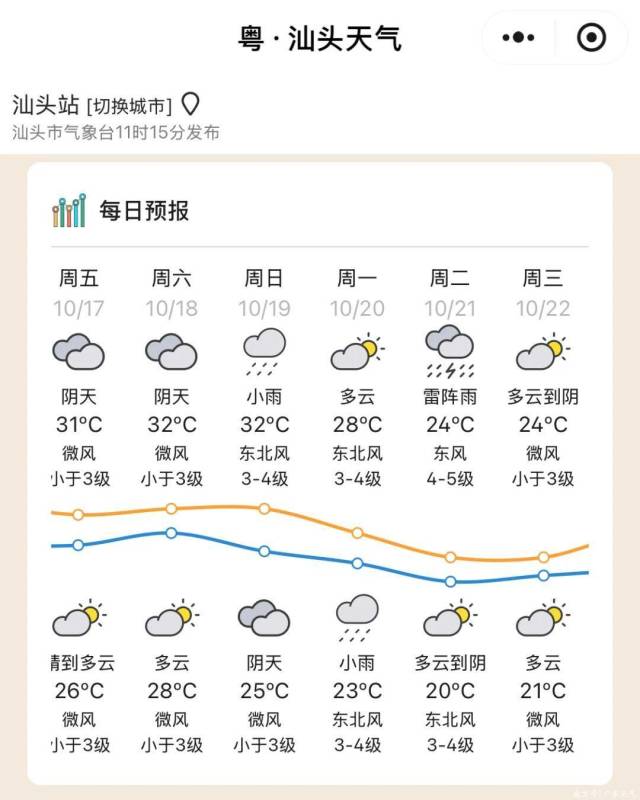 21-23日,冷空气持续补充影响,气温逐日下降,最低气温将出现在22日或23日早晨,粤北偏北市县最低气温12~15℃;珠三角北部和粤北其余市县14~16℃;其余市县17~20℃。