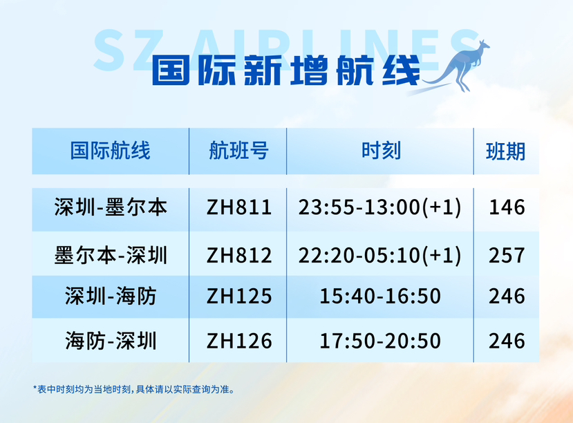 国际航线方面,深航首次开通深圳直飞澳大利亚墨尔本航线,该航线将于12月22日正式启航并采用空客A330宽体客机执飞,同时新增深圳-海防航线,目前国际航线网络已覆盖多哈、伦敦、巴塞罗那、曼谷、吉隆坡、金边等19个城市,持续助力深圳国际航空枢纽建设;国内航线方面,为精准匹配冬春旅游与公商务出行需求,新增深圳=西双版纳、深圳=大连,南宁=武汉=哈尔滨、南宁=合肥、南宁=常州,成都=西双版纳、成都=海口、成都=哈尔滨、成都=武汉,沈阳=达州等16条国内航线,并加密深圳=郑州、深圳=银川、深圳=石家庄、深圳=沈阳,广州=海口,成都=南通等21条热门航线班次;港澳台地区航线覆盖也持续完善,深航将继续执飞香港=无锡、香港=成都,澳门=无锡、澳门=南京,台北=深圳等航线,为旅客提供稳定高效的出行选择。