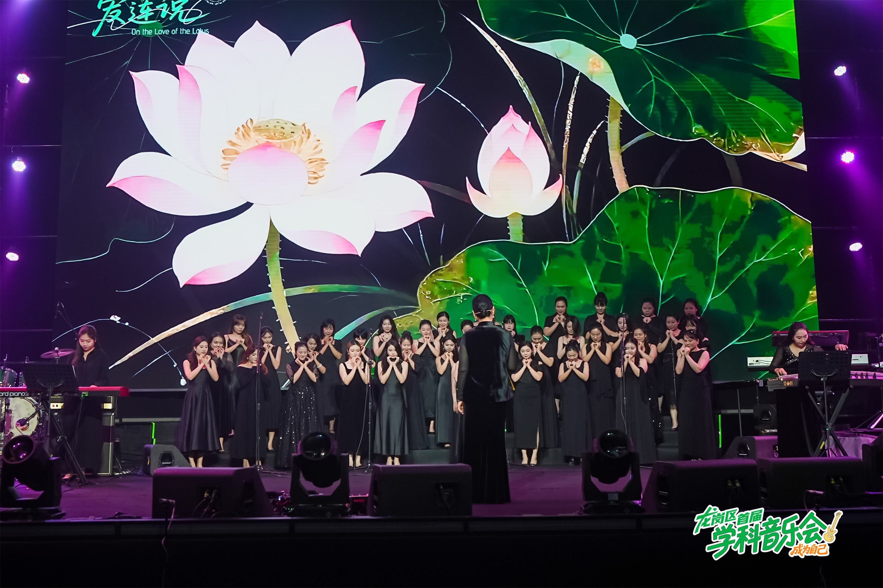 除了乐团演出,丰丽学校学生表演的《出塞》、宝龙科技城实验学校演绎的《马马嘟嘟骑》、香港中文大学(深圳)附属道远学校的《上春山》等节目,也展现了龙岗学子多才多艺、自信昂扬的风采。这三所学校弹唱的礼乐弦歌四弦琴是近年来逐步活跃于中小学音乐课堂的创新乐器,近两年我区礼乐弦歌类节目在教育部举办的“中外人文交流小使者”项目中已获国家级特等奖一次,一等奖一次,二等奖、三等奖各三次。龙岗区“纯美”女教师合唱团压轴献唱《爱莲说》,该团成立二十一年来,曾多次荣获国际国内合唱比赛金奖,特别是曾获文化部举办的第十二届中国合唱节总冠军。作为中国目前最优秀的教师合唱团队,她们用歌声传递古诗词的典雅意境,赢得掌声如潮。
