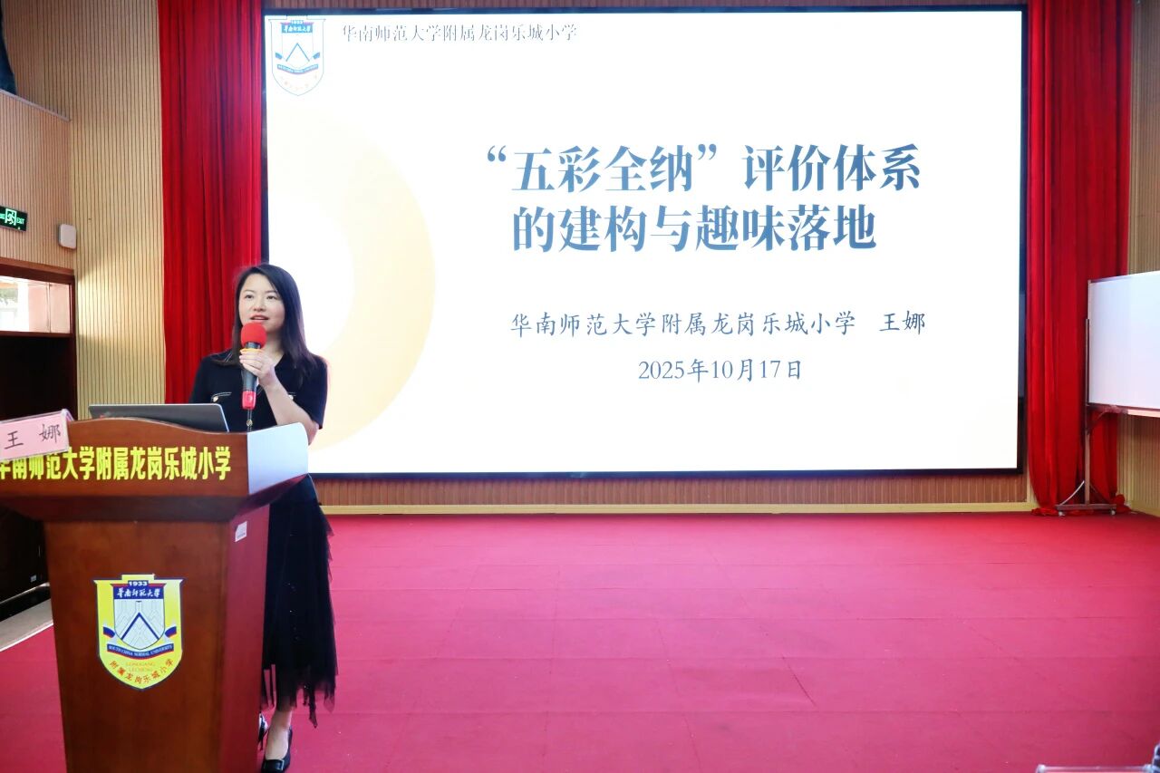 随后,交流活动移至学校报告厅,围绕“‘五彩全纳’评价体系的建构与趣味落地”展开主题汇报。华附乐小学生发展中心主任王娜担任主讲,从评价体系的初心、建构过程到实践成效,全面分享学校在综合素质评价上的探索与思考。台下喀什市的领导与教师专注聆听,认真记录要点。