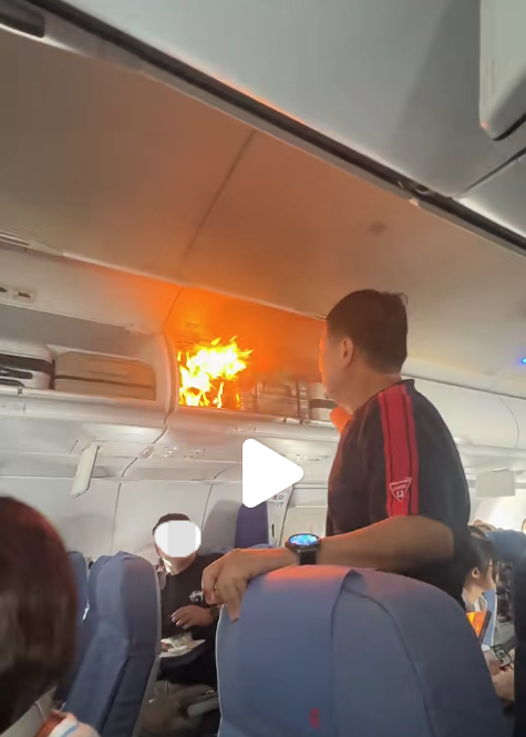 相关视频显示,一航班的行李架出现明火,有乘客呼喊快拿灭火器。“飞机飞一半起火了,在飞机上快被熏窒息了。”有自称是该趟航班旅客的网友表示,当时,整个客舱都是烟,行李架都熏黑了。