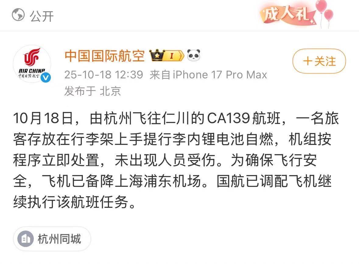 18日12时39分,中国国际航空官方微博发布消息称,10月18日,由杭州飞往仁川的CA139航班,一名旅客存放在行李架上手提行李内锂电池自燃,机组按程序立即处置,未出现人员受伤。为确保飞行安全,飞机已备降上海浦东机场。国航已调配飞机继续执行该航班任务。