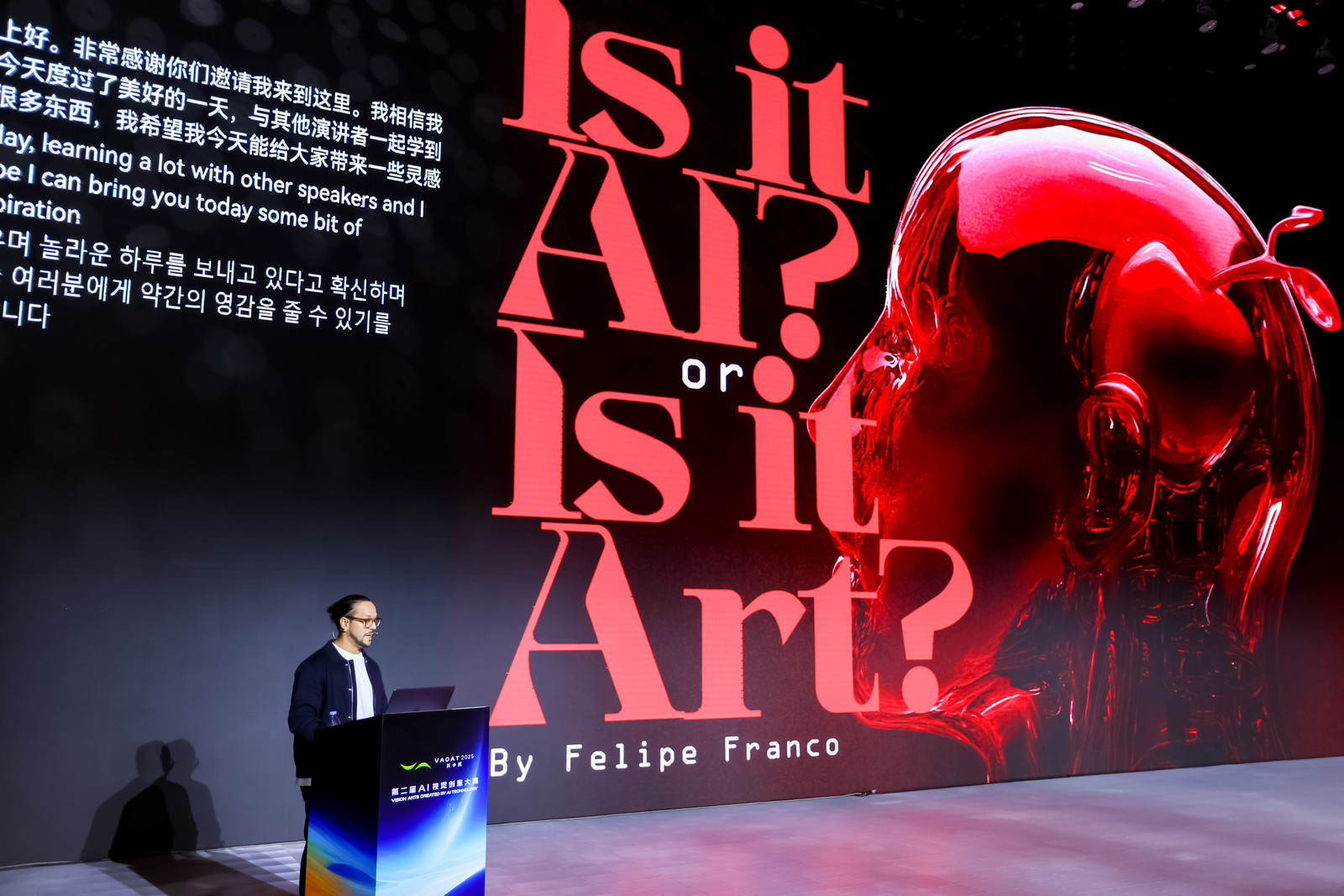 来自德国的Felipe Franco作为评委和分享嘉宾参与瓦卡奖。身为多次荣获纽约ADC、红点、IF、戛纳狮子奖和金铅笔广告奖的创意总监,他在分享中提出了深刻见解:“我们坚信,AI与艺术并非对立,而是可以共生的创造性伙伴。艺术家需要在与机器协作中坚守人格、真实性与远见,市场也应更珍视创意背后'人'的价值。当我们把AI重新定义为服务想象力的'新调色板',而非单纯的效率工具时,它便有望成为最具人性的创作媒介。”