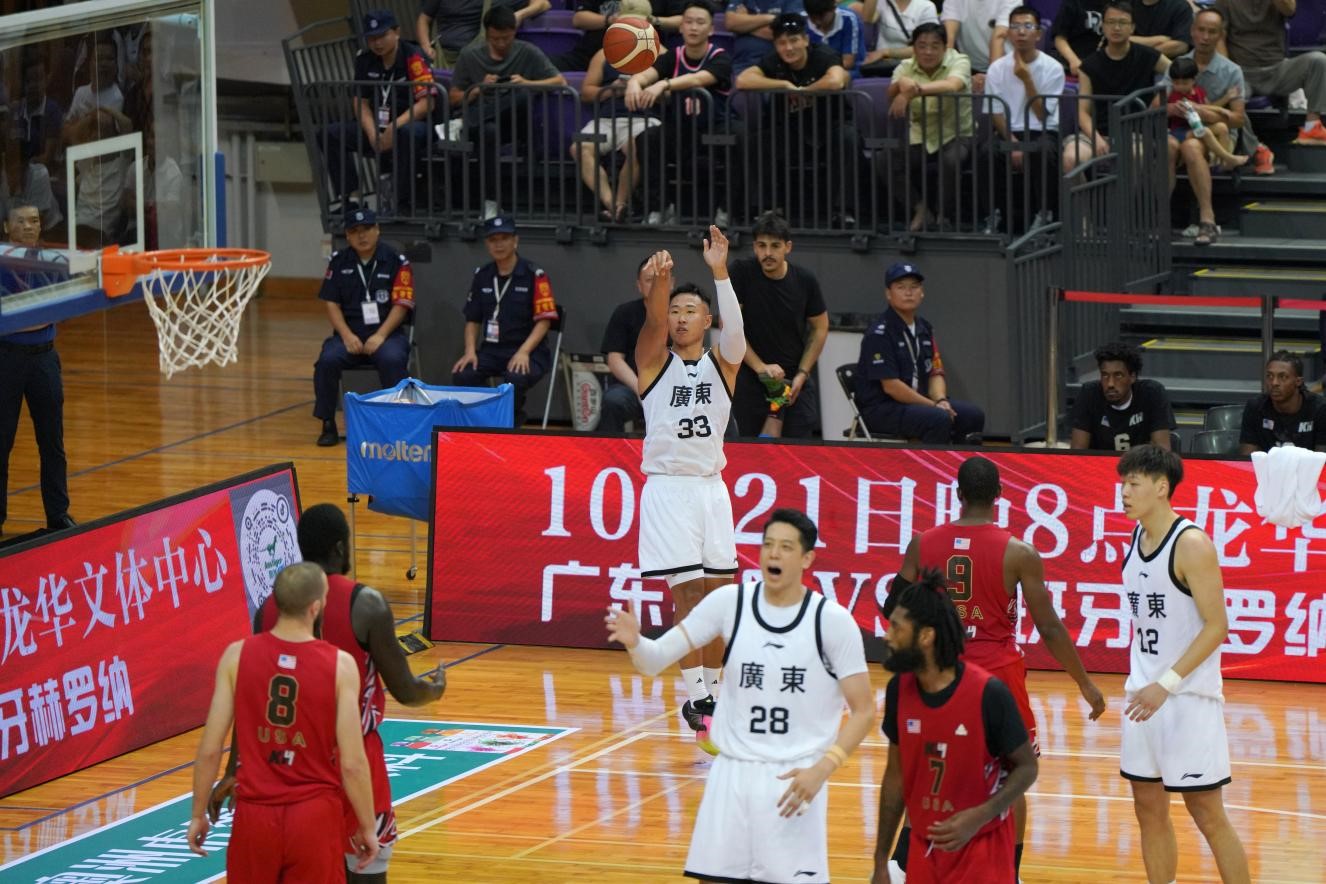 10月17日晚,广东全运男篮在深圳宝安体育中心体育馆迎来与美国肯尼哈奇男篮的热身赛,凭借精准的投篮命中率和密不透风的放手,广东全运男篮最终以一场大胜拿下胜利。