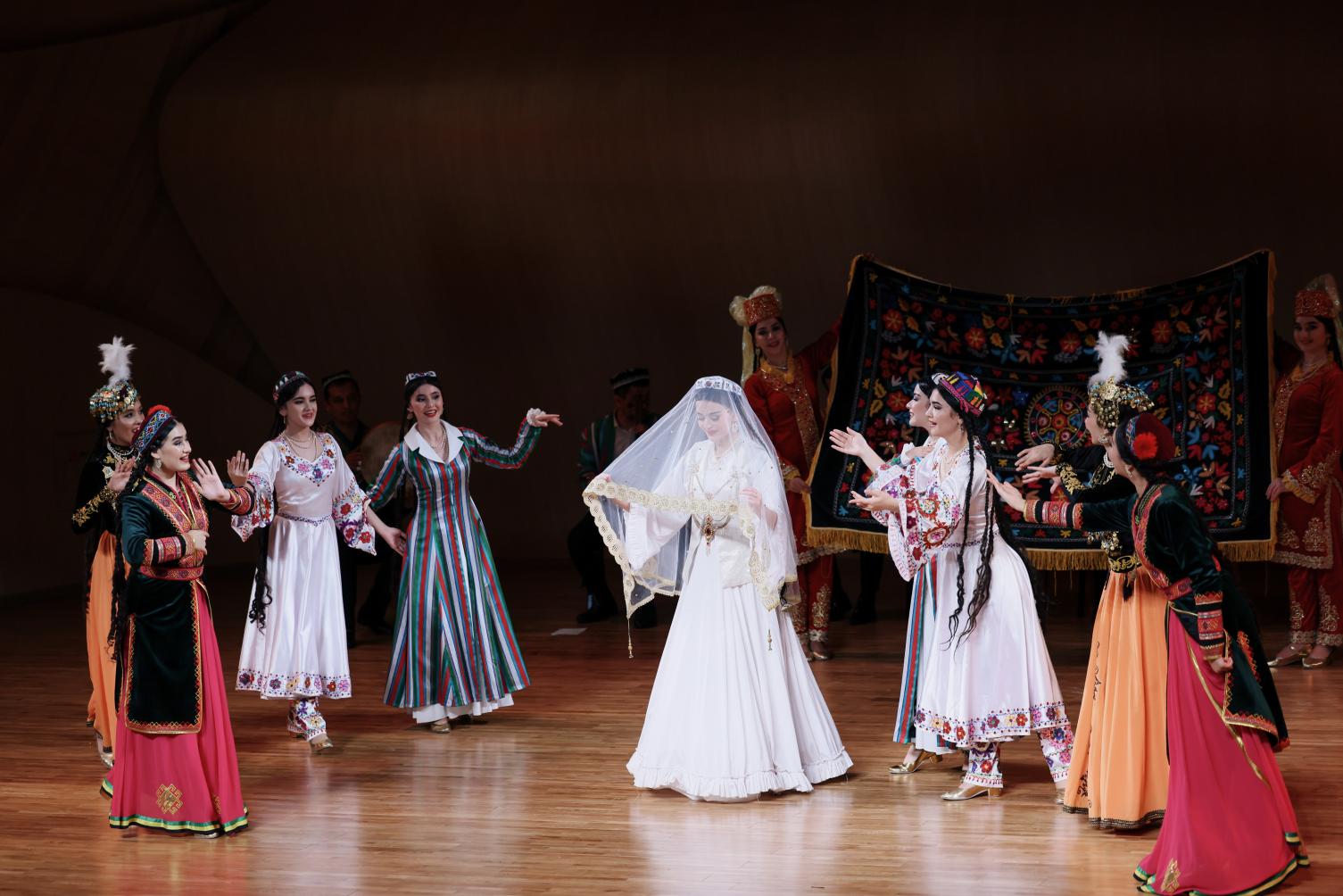演出中段,《拉茲吉》延續傳統音樂的韻味,盡顯民族藝術的典雅。《沙博達拉爾》與《安集延舞》則展現多元創作視角,前者載歌載舞,演繹出細膩的情感流動;後者聚焦安集延地區的獨特風情,舞姿間滿是地域文化的鮮活氣息。《多伊拉之聲》更是以樂手古利亞姆容·穆罕默德紮諾夫的精湛演奏為核心,將多伊拉樂器的靈動韻律與舞蹈完美融合,成為整場演出的一大亮點。