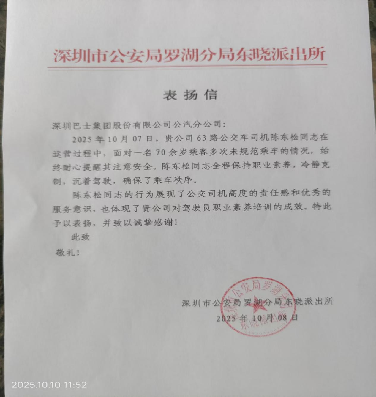 陈冬松师傅在此次事件中的表现,充分展现了深圳巴士集团驾驶员优秀的职业素养和心理素质,也是公司长期注重员工关怀、加强服务质量培训的成果体现。集团始终倡导“以人为本”的服务理念,不仅关爱乘客,也同样关爱每一位员工,通过“员工关爱中心”等渠道,为驾驶员提供心理支持和情绪管理培训,帮助他们更好地应对工作中的挑战。