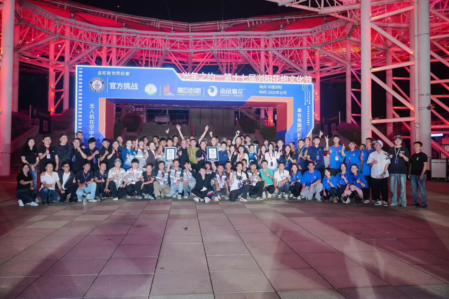 本次打破纪录的地方位于湖南浏阳。上午完成的是无人机在空中表演发射最多烟花,当晚创造了“单台电脑控制最多无人机同时升空”的新纪录。高巨创新有关负责人称,此次项目由公司联合浏阳当地烟花总会及多家烟花公司共同完成。“我们不仅旨在成功打破世界纪录,更希望向全球展示当前无人机编队表演行业的最新形态——即无人机与烟花的深度融合与协同演绎。”