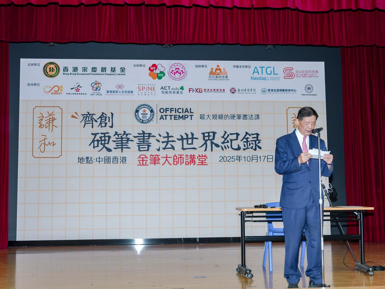 【香港經濟導報網訊】香港 — 2025年10月17日,梁顯利油麻地社區中心洋溢著濃厚的文化氛圍與青春活力。由香港宋慶齡基金、We Like Hong Kong、滬港婦女會主辦、民政事務總署協辦的“金筆大師講堂——齊創硬筆書法世界紀錄”活動在此隆重舉行,來自香港油尖旺區多間中、小學的291名學生齊聚一堂,以筆墨寄情、以書法傳意,順利完成一場意義非凡的硬筆書法課,成功挑戰並創下“最大規模硬筆書法課”健力士世界紀錄TM,為慶祝中華人民共和國成立76周年,獻上一份蘊含中華文化底蘊的珍貴禮物。由中聯辦教育科技部葉水球副部長、香港特別行政區政府油尖旺民政事務專員余健強先生擔任活動主禮嘉賓。