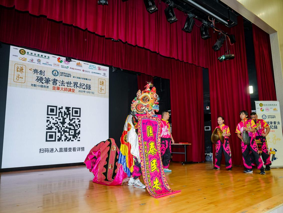 活動尾聲,香港客家人文化協會帶來精彩的舞麒麟表演,威武靈動的麒麟伴隨著鏗鏘的鼓點騰躍翻轉,將現場氣氛推向高潮。傳統民俗藝術與書法文化在此刻交融,既為本次創紀錄活動畫上圓滿句號,也讓在場師生深切感受到中華文化的多元魅力與蓬勃生命力。