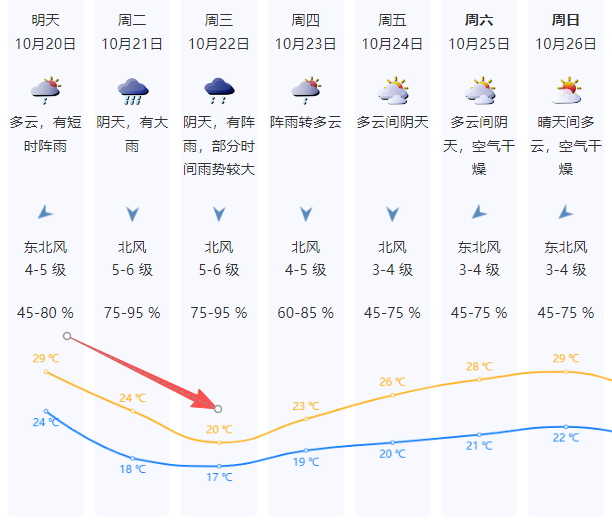 受冷空气和“风神”的共同影响,周一至周四(10月20日—23日)将有明显大风降温降雨天气,沿海和高地最大阵风8—10级,降雨频密,累计可达大雨到暴雨,气温降至20℃以下,体感明显转凉,大风降温降雨最明显在10月20日夜间至10月22日。