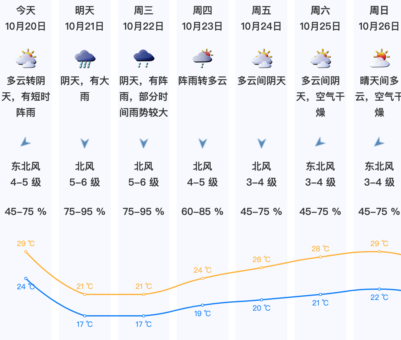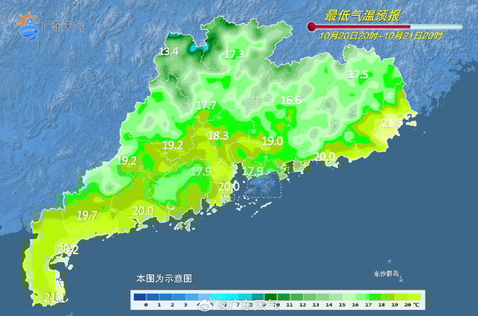 20日,粤东、珠三角南部沿海市县有阵雨局部大雨,其余市县多云,有分散阵雨。最低气温:粤北、肇庆北部、云浮西北部市县17~20℃,南部沿海市县24~26℃,其余市县20~24℃。