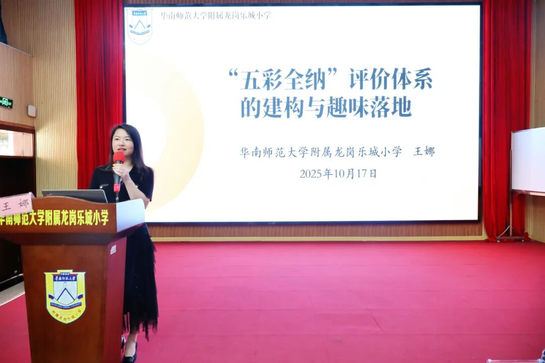 随后,交流团队移步学校报告厅,共同参与以“‘五彩全纳’评价体系的建构与趣味落地”为主题的汇报分享。该校学生发展中心主任王娜担任主讲,从评价体系的初心、建构过程到实践成效,娓娓道来该校在综合素质评价上的探索与思考。