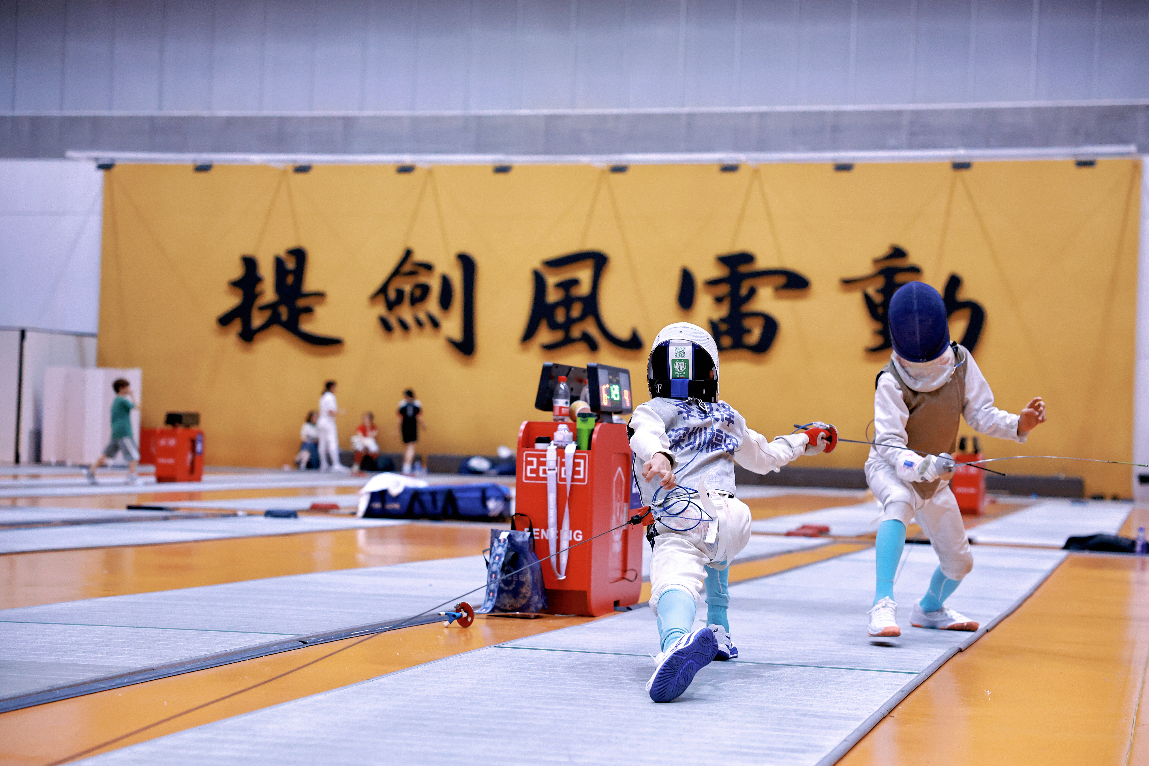 比赛现场,十余条剑道同时开赛,选手们身着白色击剑服,头戴金属护面,手持花剑、重剑或佩剑,在剑道上展开攻防较量。作为中国击剑运动的标志性人物,2012年伦敦奥运会男子花剑金牌得主雷声亲临赛场观赛事。