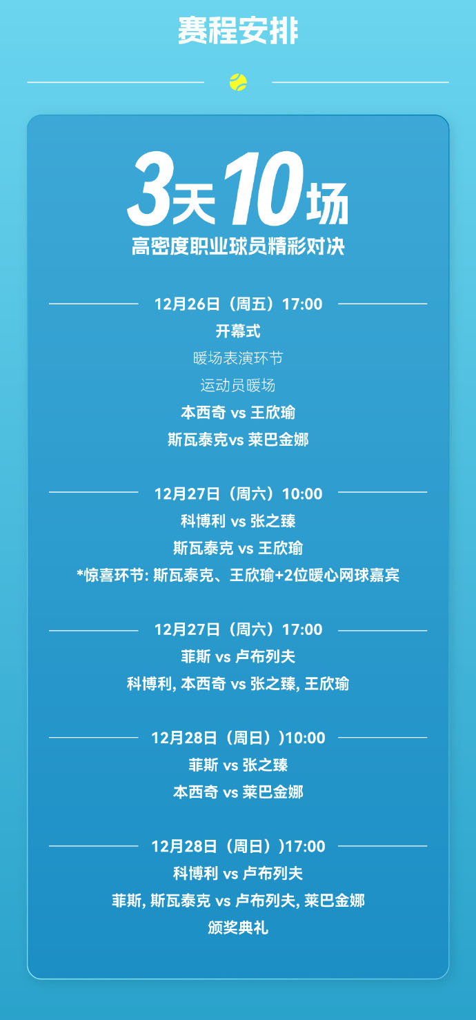 三天赛程内将展开10场高密度对决,覆盖男子单打、女子单打、混合双打三大项目,采用三盘两胜制,以欧洲队与世界队的团队对抗模式开展,同时增设明星表演赛、公益赛,兼顾专业性、观赏性与公益属性。赛事期间,深圳网球金花王欣瑜将与本西奇、斯瓦泰克交锋,还将与张之臻再组成奥运会混双组合,对阵本西奇/科博利。