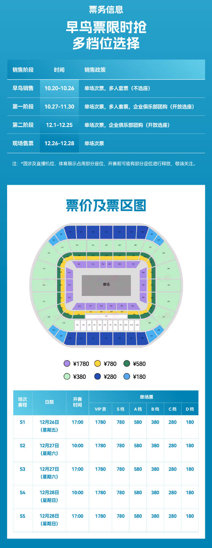 即日起,球迷朋友可以以通过大麦网、猫眼、秀动、票星球等渠道购票,分为单日通票、全程通票和单场次多人套票。单日通票含当天所有场次S档/A档票(固定区域),早鸟价8.5折(S档1320元、A档980元);全程通票包含3天内所有场次S档/A档票(固定区域),早鸟价享受8折优惠(S档票价3100元,A档票价2300元);场次多人套票分为S档、A档和B档,提供双人套票(早鸟价享8.5折优惠)及三人套票(早鸟价享8折优惠),例如S档双人套票价格为1320元,三人套票价格为1870元。