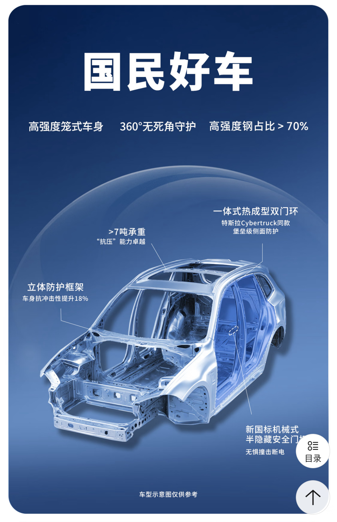 据悉,新车为5座车型,定位小型轿车,续航里程为401-600公里,电池容量在51-60千瓦时(kWh),快充时间约为30分钟内。新披露的信息显示,在车身结构方面,该车采用高强度笼式设计,高强度钢占比超70%,正面立体防护框架使车身抗冲击性提升18%;侧面配备一体式热成型双门环,采用与特斯拉Cybertruck同源技术,并搭配新国标机械式半隐藏安全门把手。在性能方面,车辆整备质量超同级车型300公斤,轮距宽于行业45毫米、胎宽多出10毫米,麋鹿测试成绩在时速75公里以上。