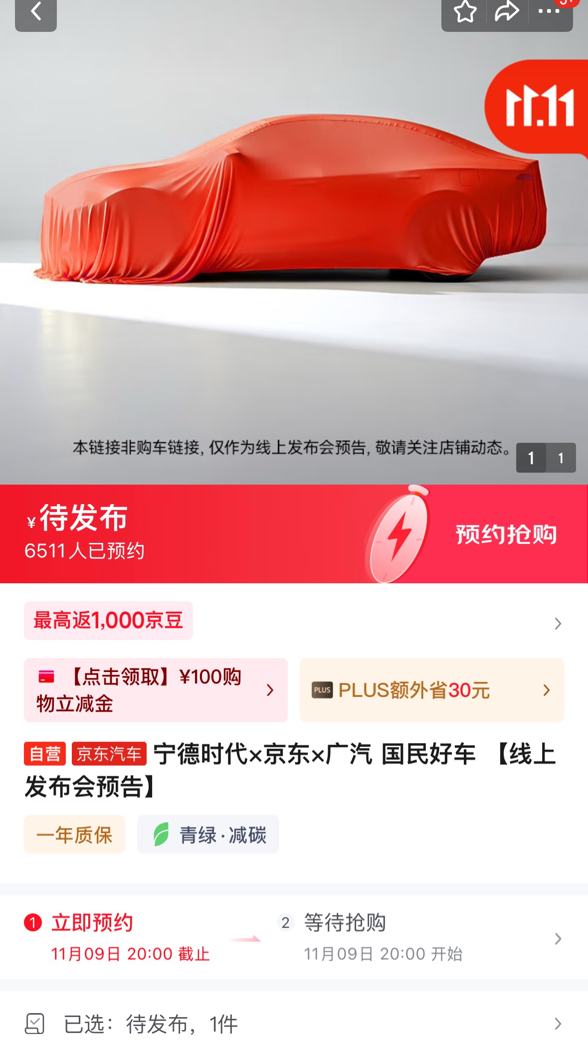今年10月14日,京东在11.11惊喜开放日上宣布,联合宁德时代旗下的时代电服和广汽集团共同推出“国民好车”。新车将在11月9日发布。在三方合作中,京东主要提供用户消费洞察和独家销售,不直接涉及制造环节。