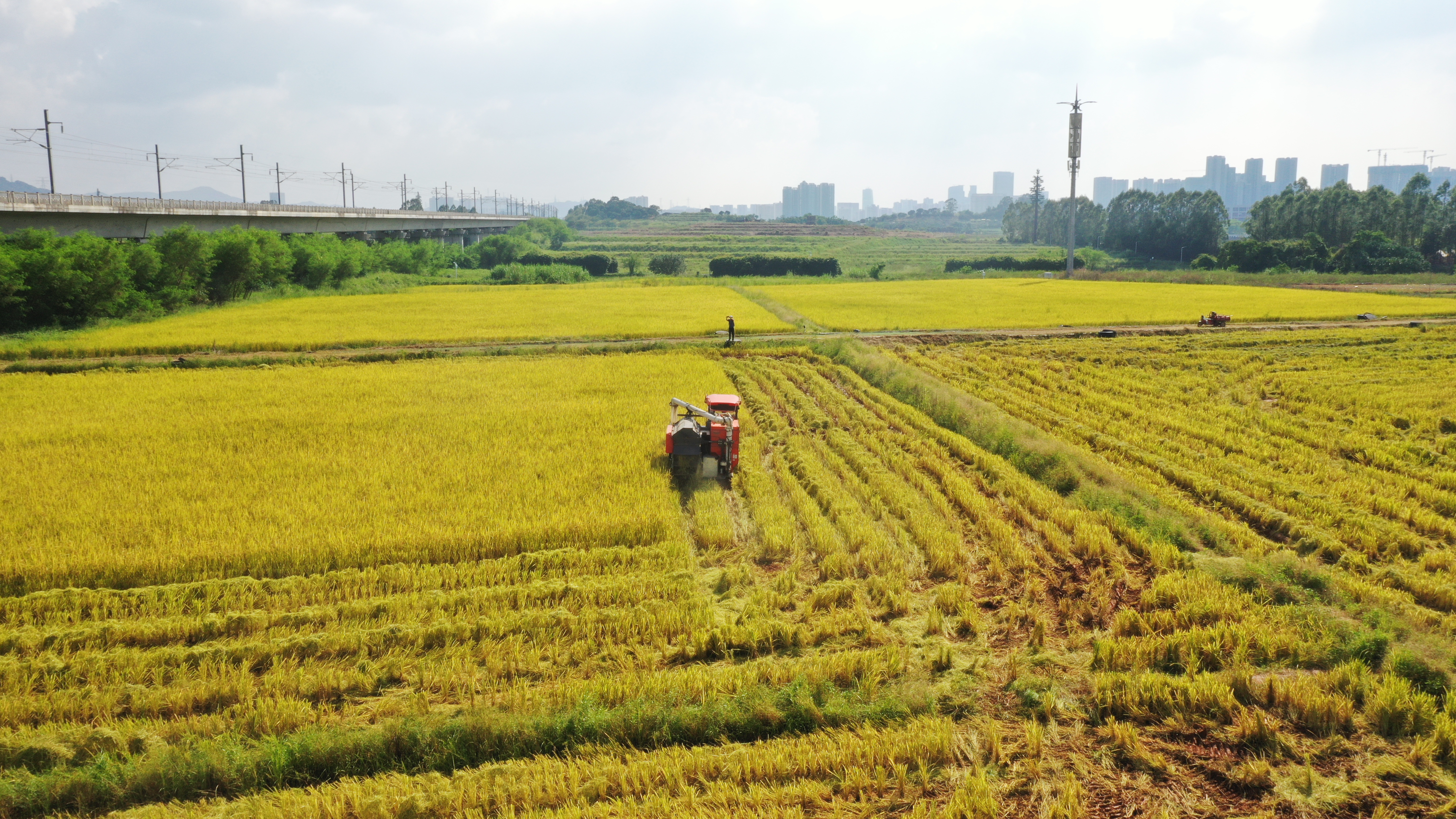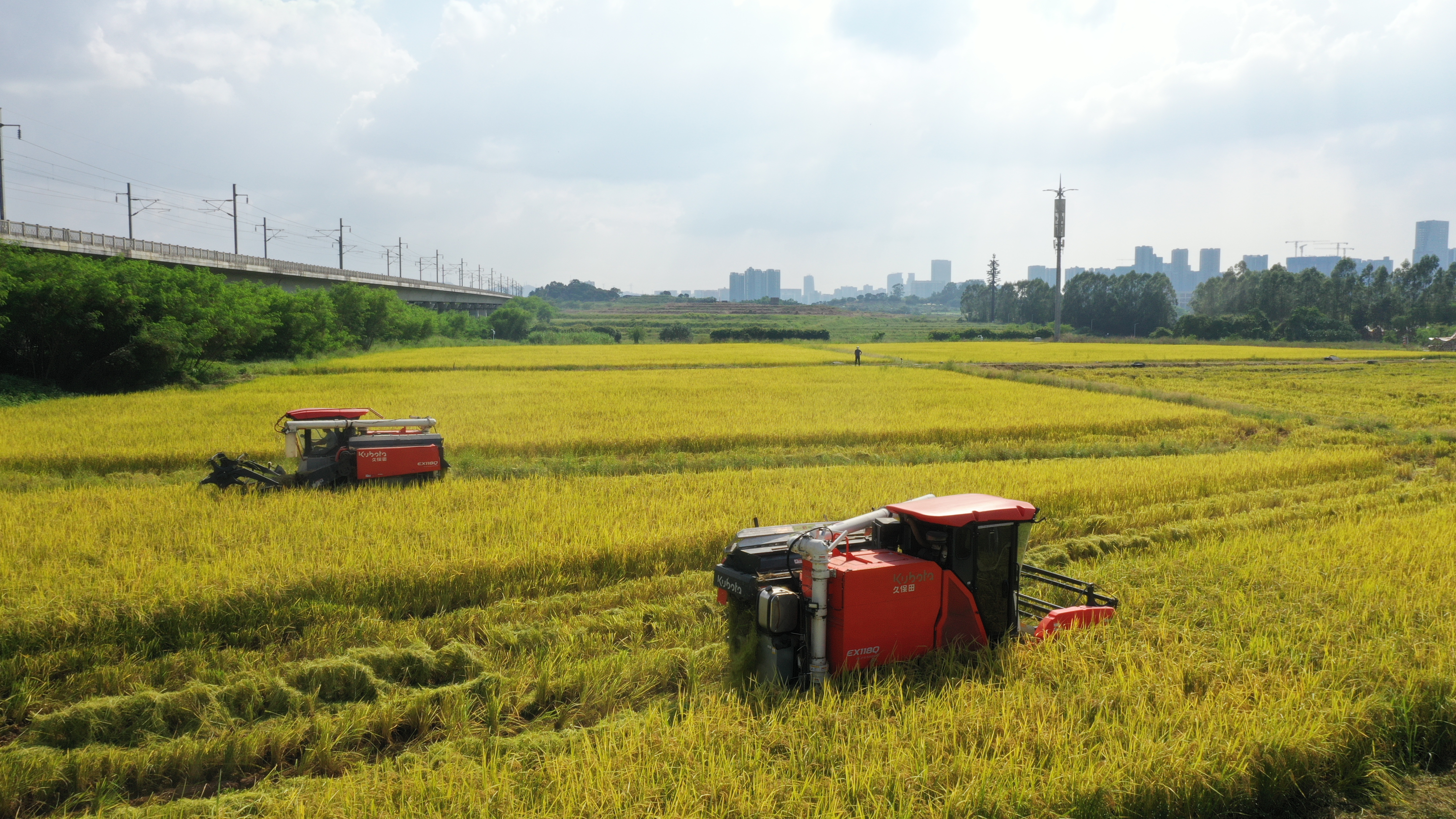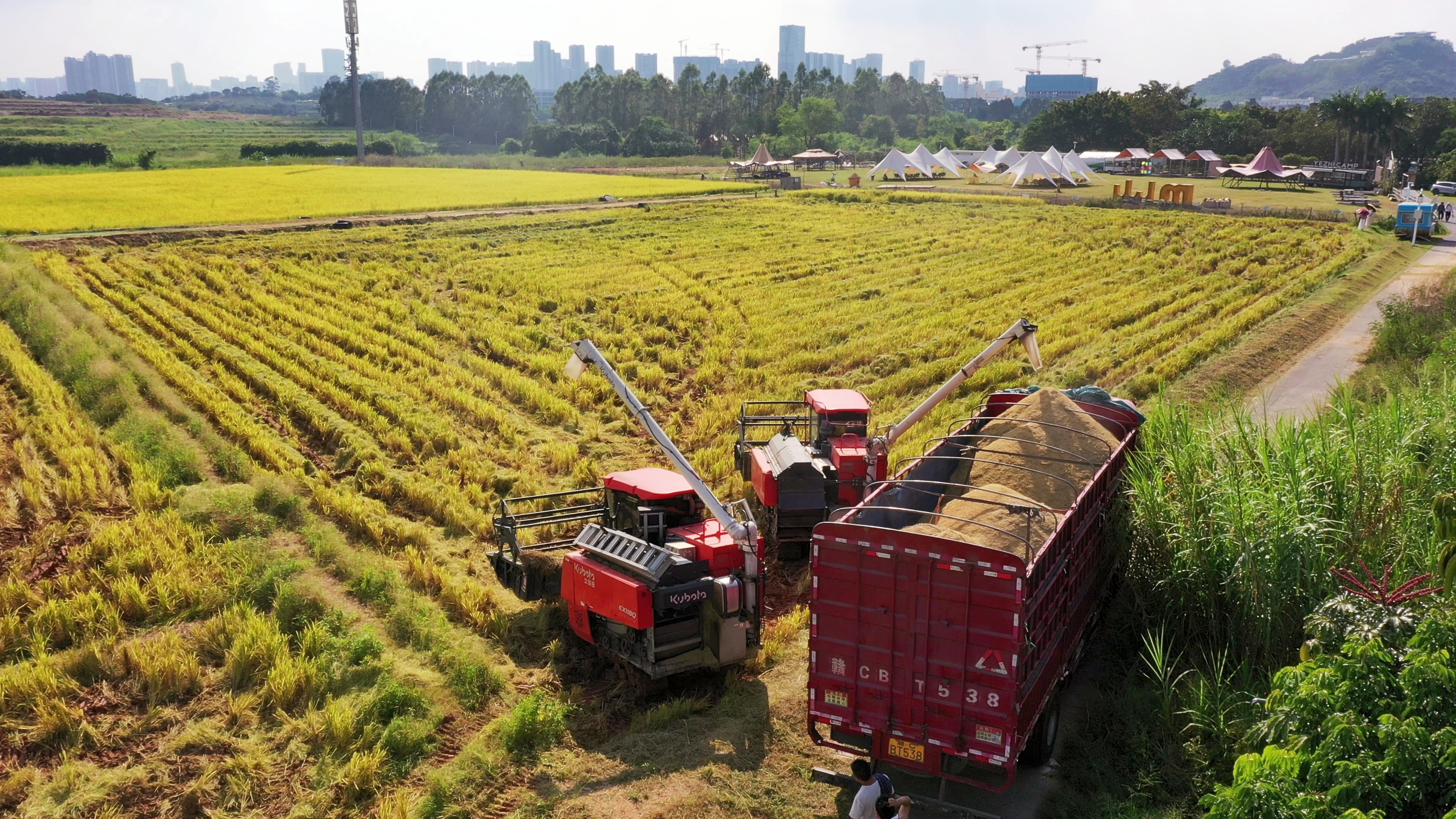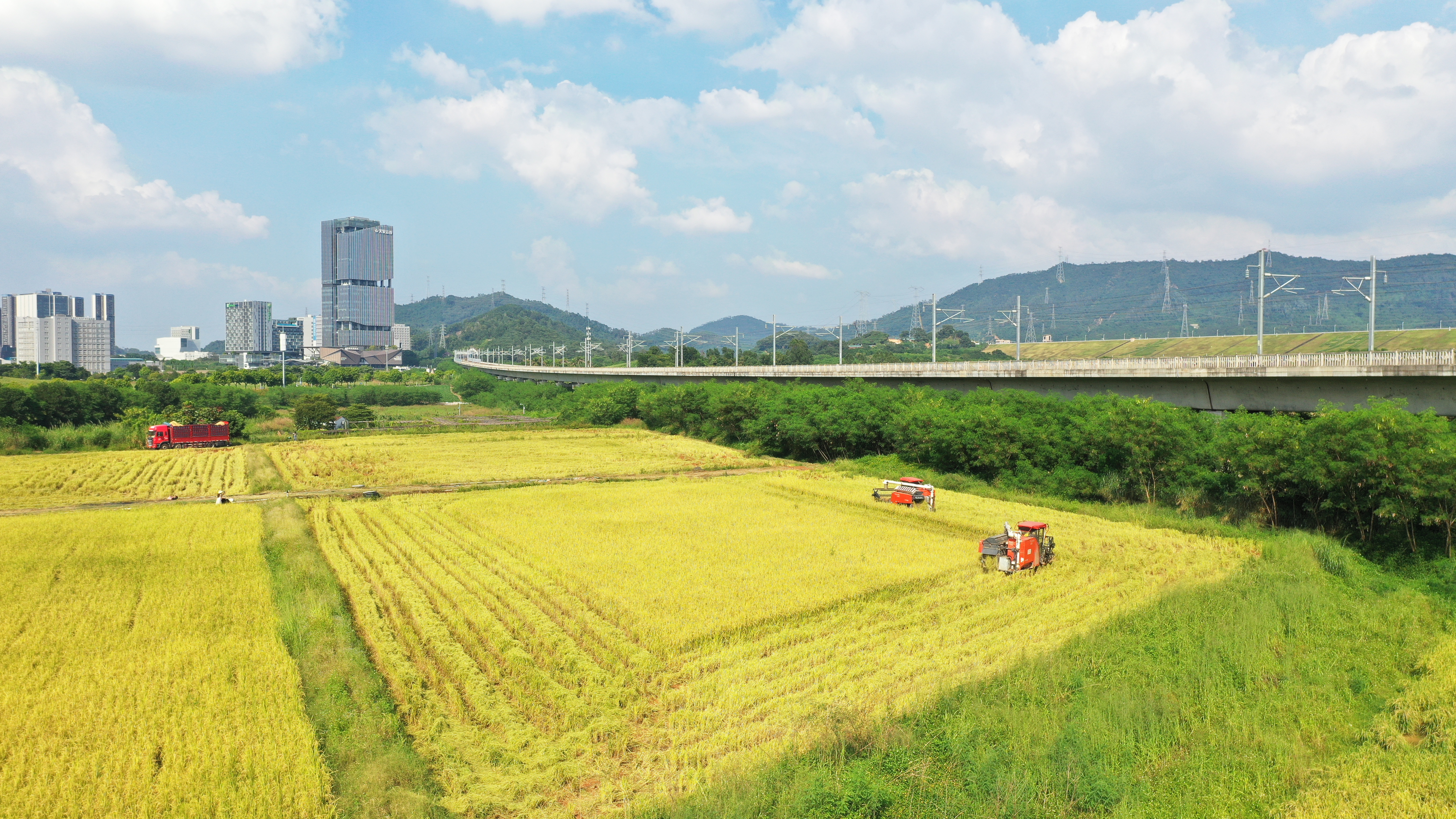 据了解,本次收割的水稻面积约300亩。自7月以来,这片稻田历经青青禾苗到金色稻浪的蜕变,吸引了大批市民前来打卡观光,成为深圳都市生态版图中一道独特的风景线。收割现场,多台现代化联合收割机轰鸣作业、纵横穿梭,以高效运转勾勒出都市天际线下的丰收盛景,为市民现场呈现了一场生动壮观的农业生产景象,成为都市生活中难得一见的鲜活图景。