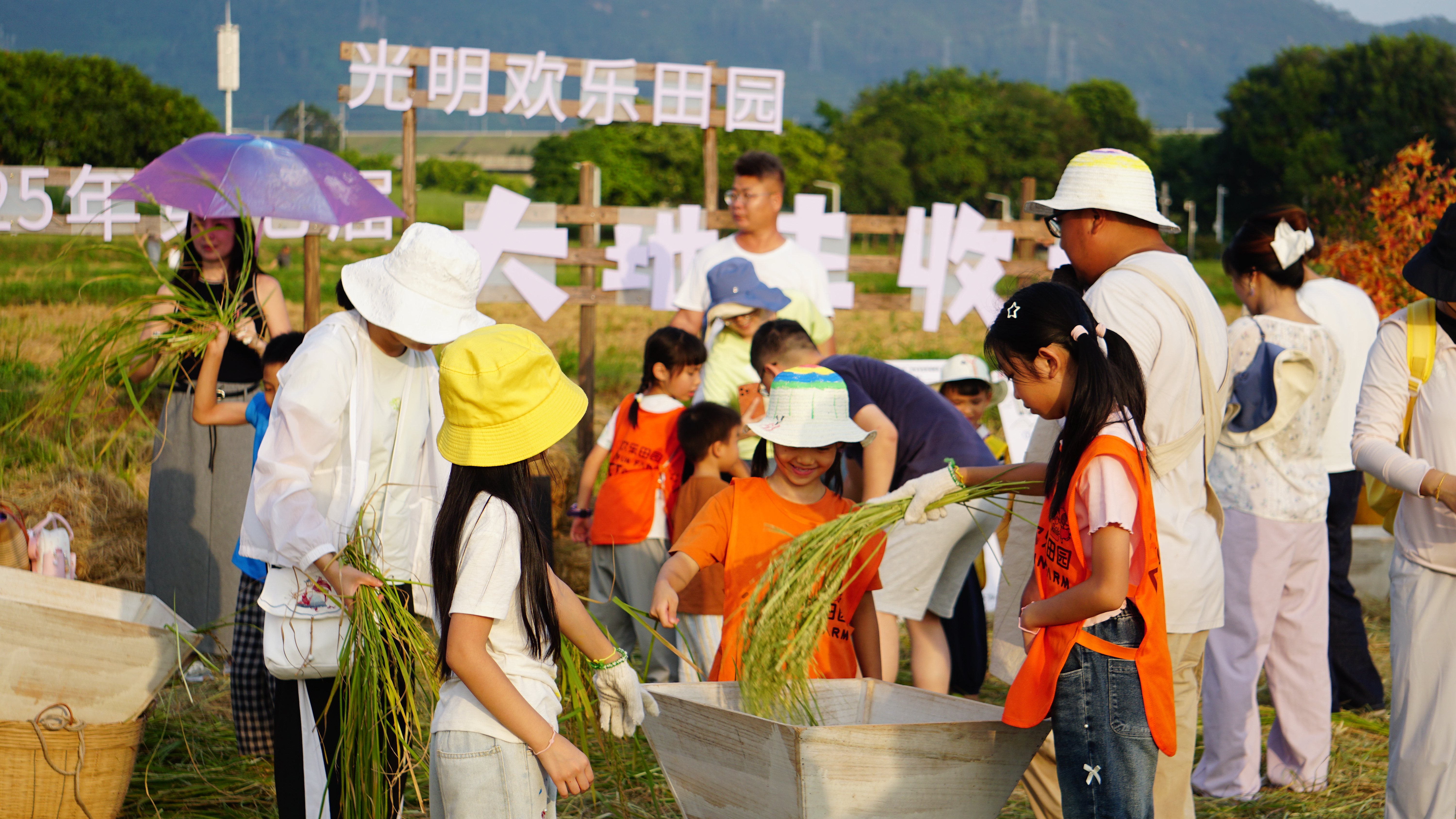值得关注的是,在完成大面积机械收割后,光明欢乐田园特意预留了部分稻田,作为少儿自然劳动教育的“大地课堂”,园区“欢乐小农夫”研学系列课程“稻谷丰收营,于10月18日开启2025年首期活动,将持续开展至11月中旬。孩子们在农事导师带领下,学习水稻的一生科普课堂,并亲手体验水稻收割、打谷、脱粒等传统收稻工序。通过亲身体验农事,孩子们不仅能够了解水稻从田间到餐桌的全过程,更能直观感受农业劳作的艰辛与意义,从而懂得珍惜粮食、尊重劳动。